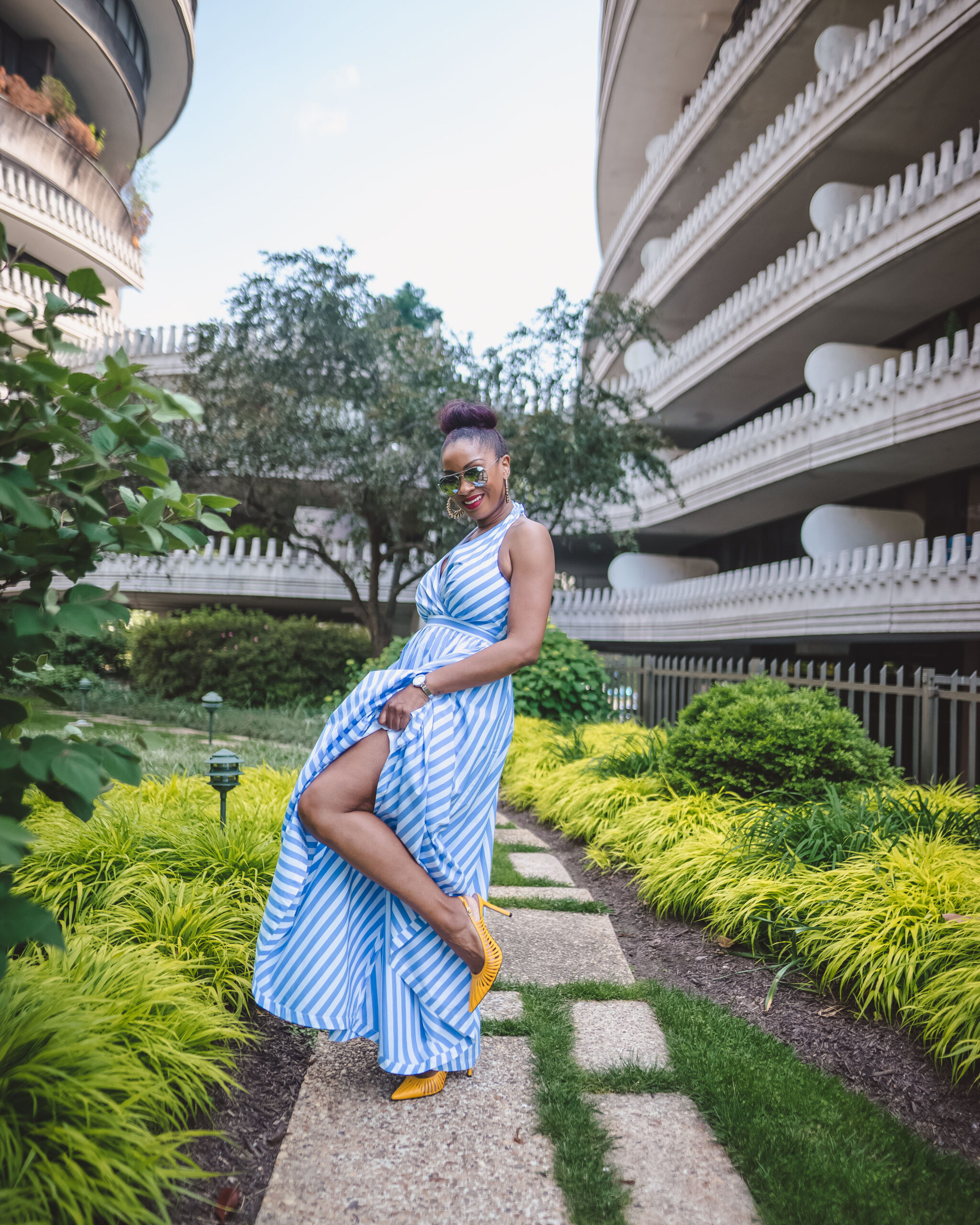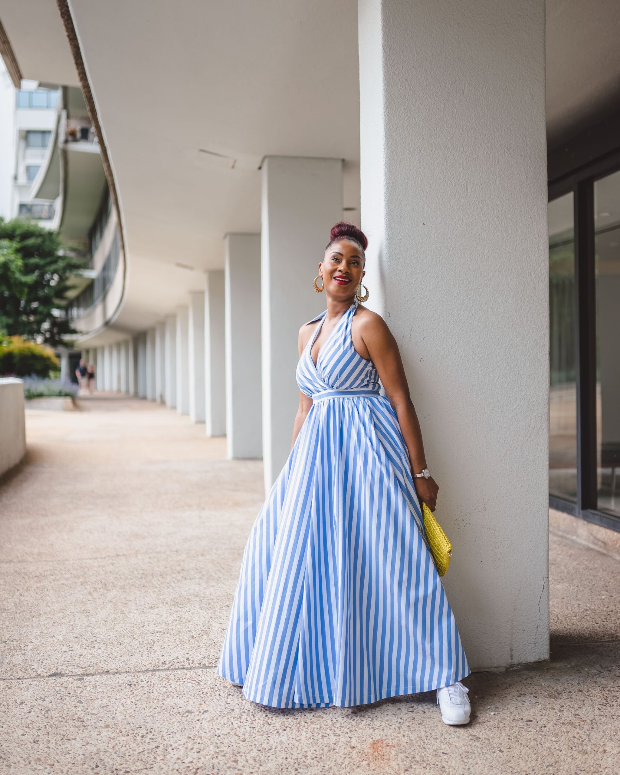 This halter jumpsuit looks like a long dress but it’s not which is what I like about it. It’s also bright blue and white stripes with pockets, and we love anything with pockets don’t we ladies? Stripes also make you look and feel tall and the pattern is great with solid colored accessories. Jumpsuits are interchangeable with heels, sandals, sneakers, or wedges. Add a cute bag and sunhat and it’s a look!