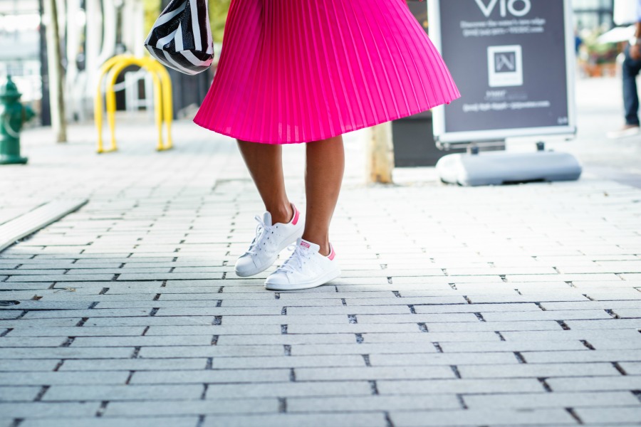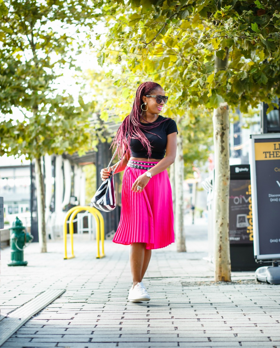 A midi pleated skirt is one of those items in your closet you won’t soon get rid of. Instead, you’ll probably keep it on repeat season after season. I mean, how many years have pleats been in existence? Long before you, or I were even born, and….yup, they’re still here! As a more “low” than “high” shopper, I’ll buy clothes from just about anywhere including one of my favorite places to spend useless hours, Target. I went into my local Target for a few travel items a few days ago to pick up sunblock and toiletries and came out with a pleated skirt. How sway?? Those hot pink pleats on their “A New Day” rack called my name. And here we are. And here I am, rocking a midi pleated hot pink skirt from Target. Voila.