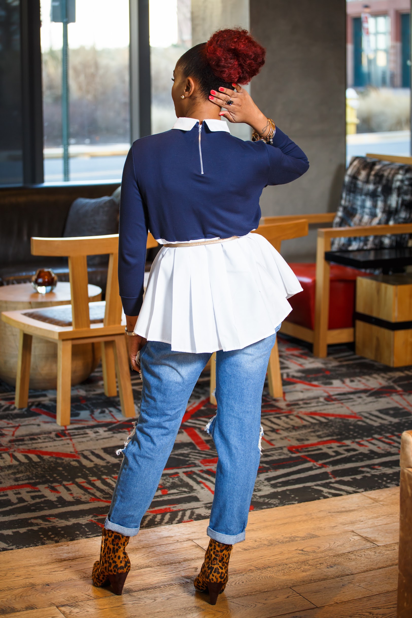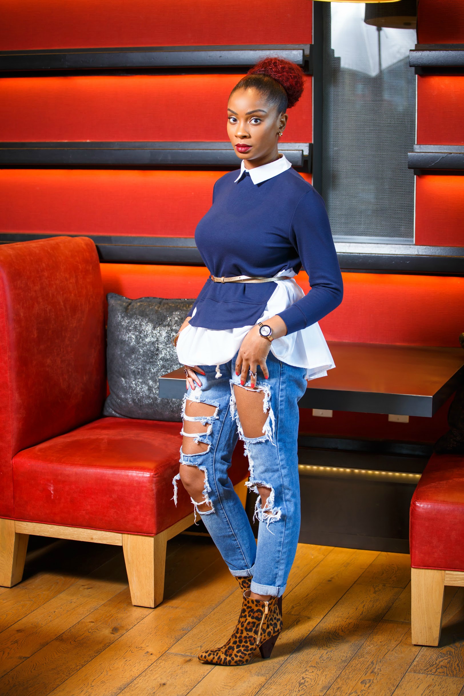 Then Saturday night comes and what do you wear? Girl pull out that same shirt/sweater combo, this time twist it up with destroyed denim and printed booties and add a belt. Destroyed denim is as far away from professional as denim can get, but the professional top still pairs well. What do they call it? Church on top, party on the bottom? Let’s go!