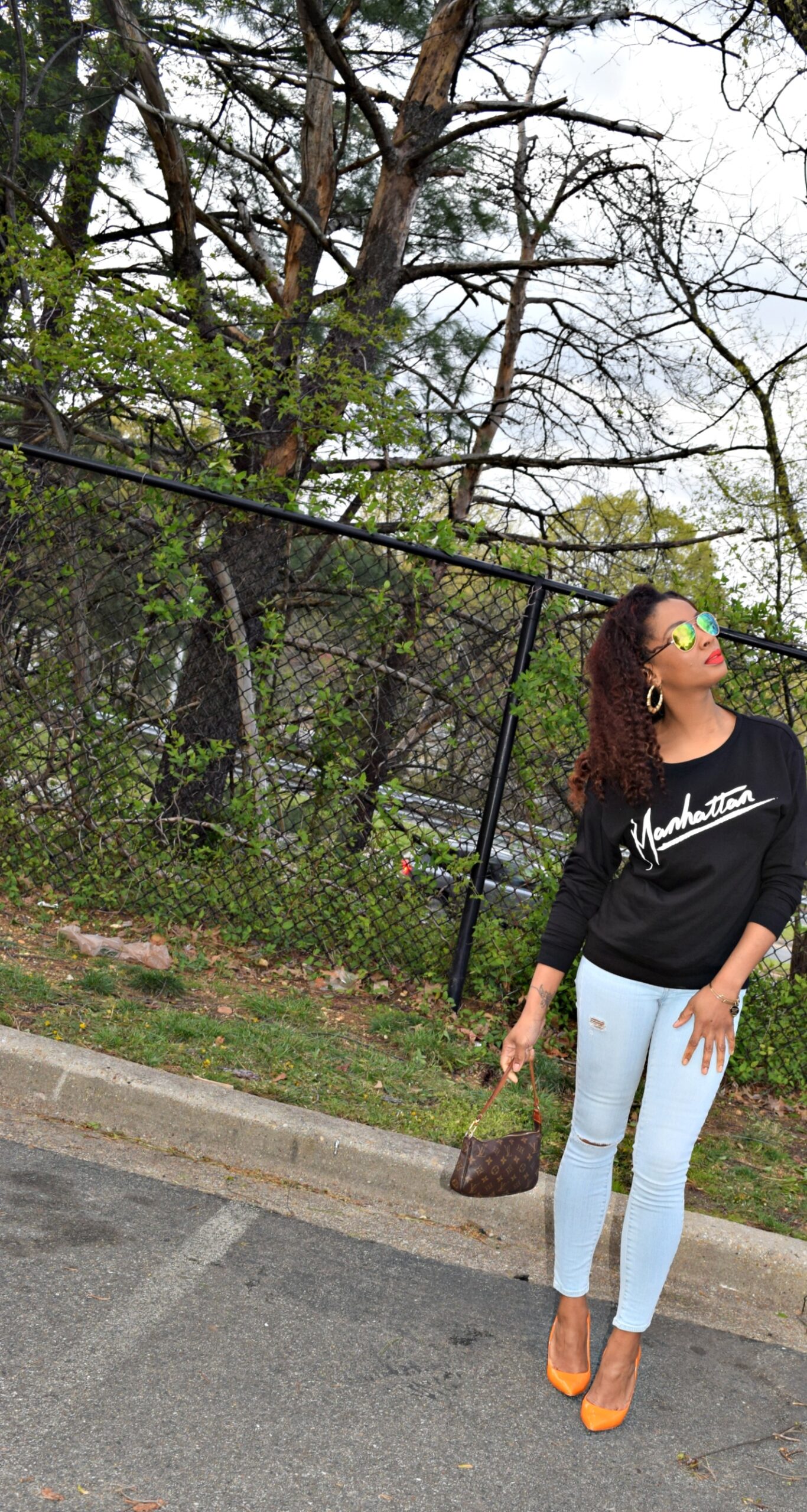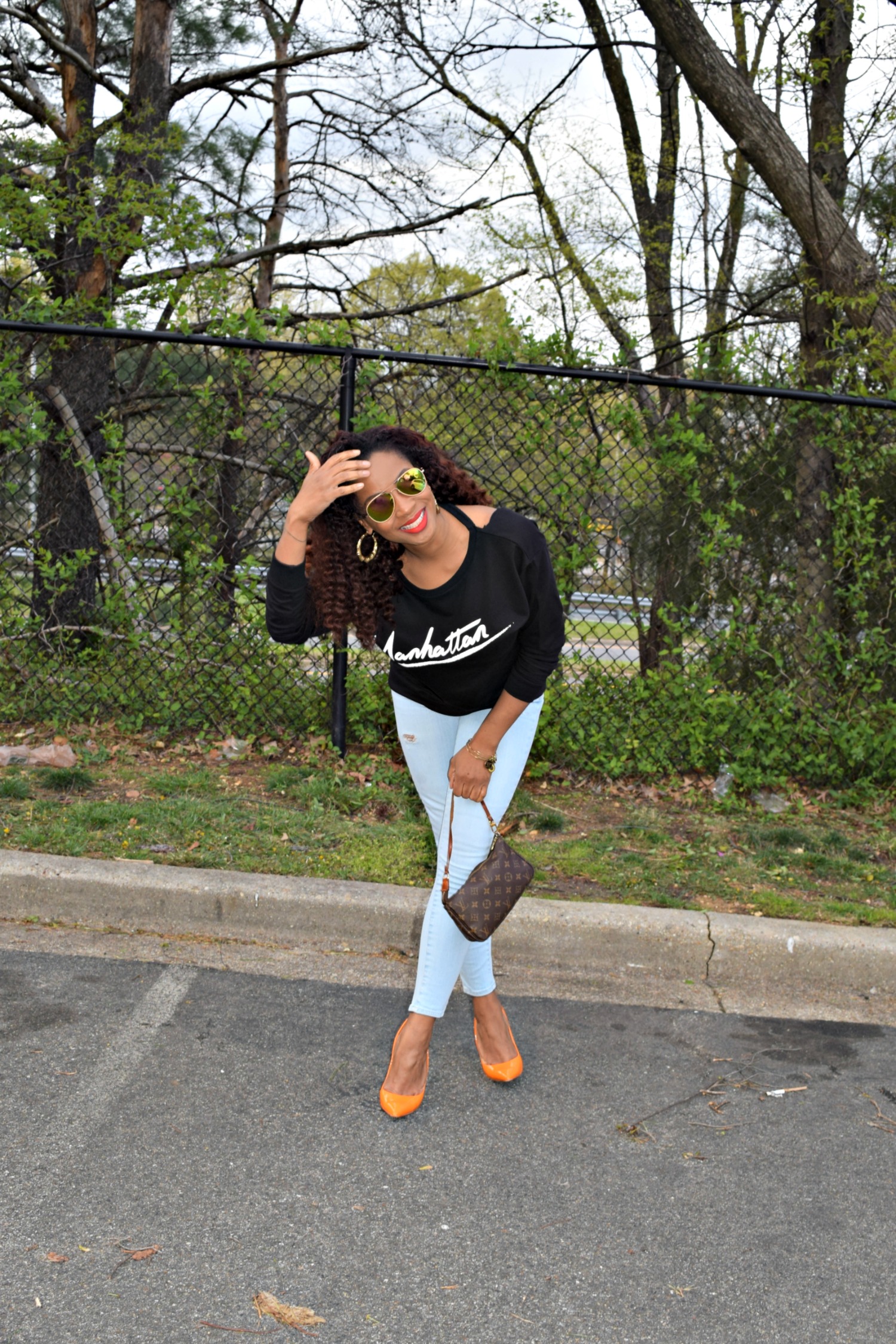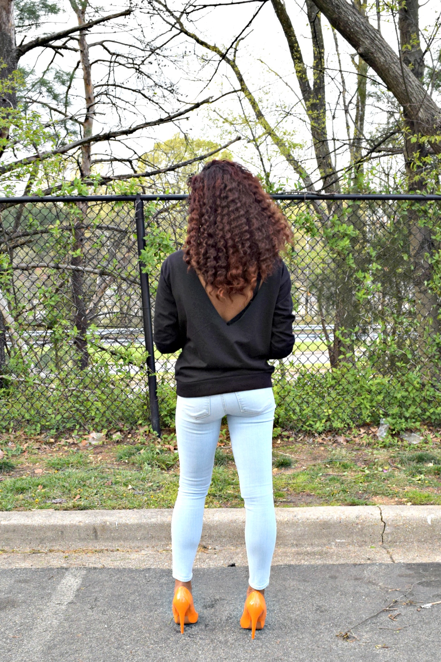 April here in DC has not been exactly the warmest of weather. Actually it’s been rather chilly which puts me and my wardrobe in a space between warm and cold. As a cold-natured person, it’s hard for me to figure out what to do on days that have 45 degree mornings and 75 degree evenings. It can be tough deciding if I want to put on a North Face vest at 7:30 am to run my daughter to school or just throw on a light jacket and go on to work so I won’t sweat to death on my commute home. I try not to confuse people with my look, but I absolutely hate being cold in any season. I say this to say, there’s a fine line between looking “winterish”, “summerish”, and “stylish” all at the same time. A fun way to combat this dilemma is a top with sleeves that shows a little skin…from the back. This look shows that I’m not in the dead of winter, and paired with skinny destroyed denim and bright-colored heels shows that I’m not in the heat of summer either.