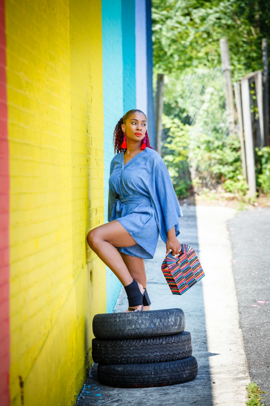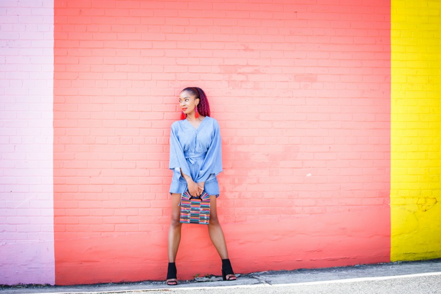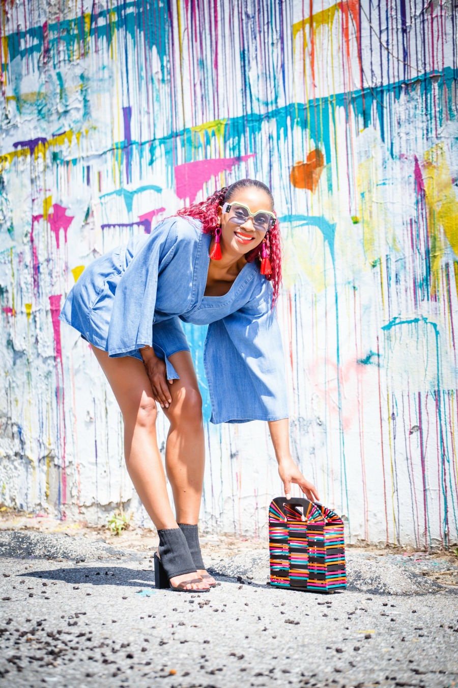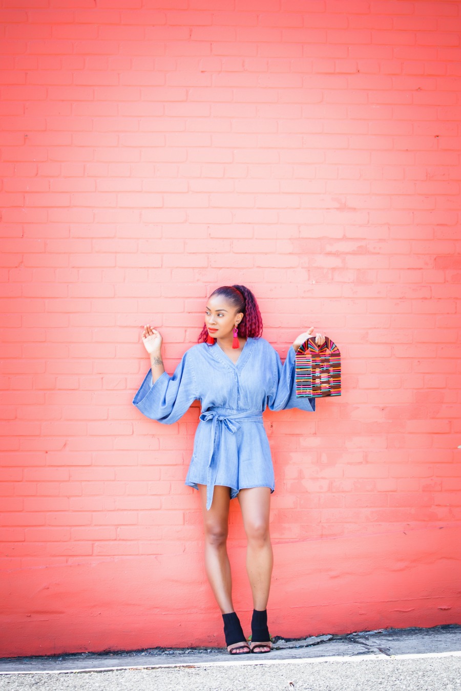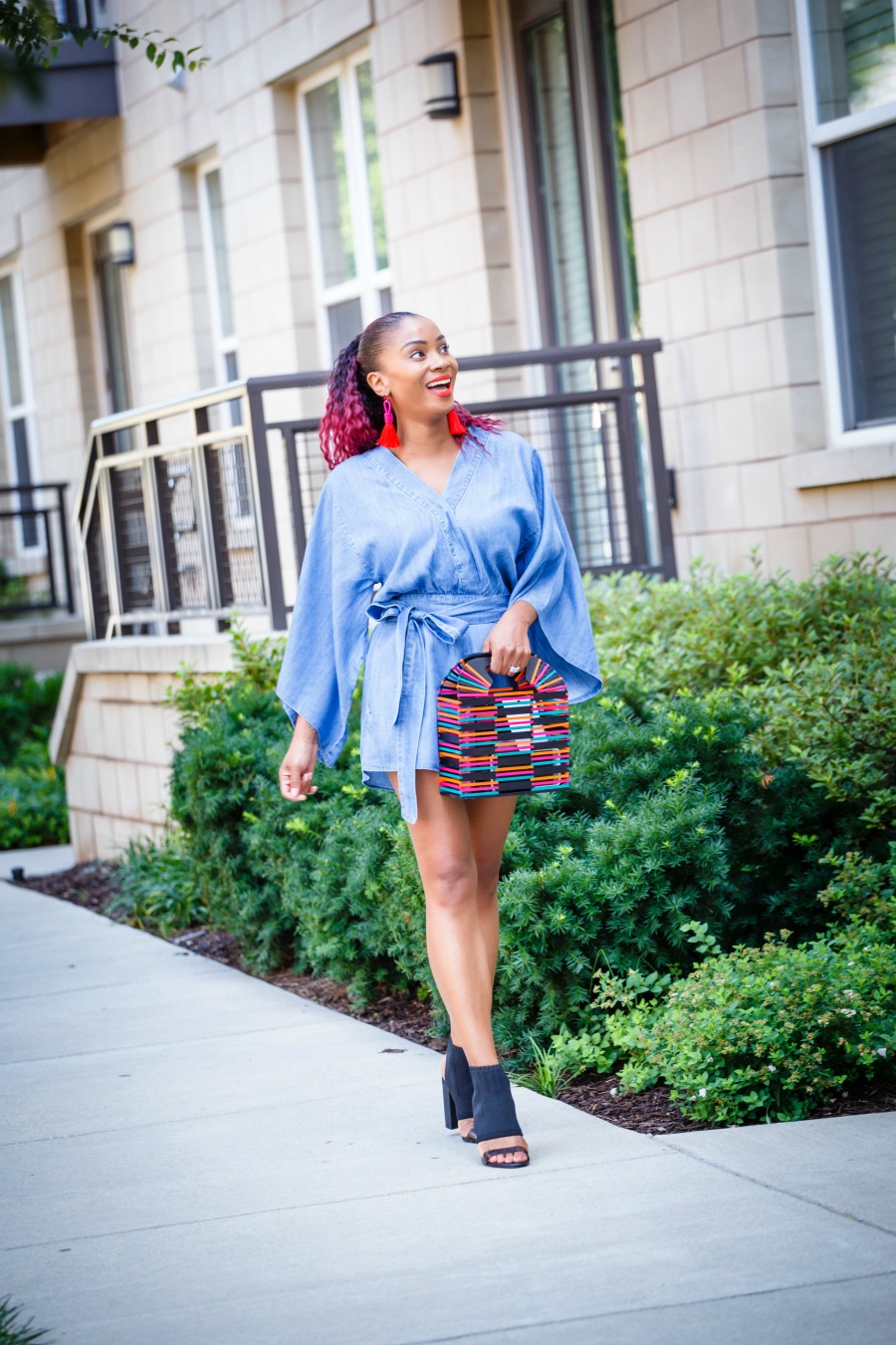 Summertime is for color! It’s a time for bright and bold, mixing and matching. Even if your clothing is not “colorful”, add some with accessories. I saw Gabrielle Union rocking a chambray romper from her new line at NY&Co. and it looked really nice on her so I tried it out. I purchased it about a month ago and never wore it until my birthday. The fit and material are spot on, it’s really soft denim with wonderful kimono-like sleeves, a large sash and loose shorts. Since it’s denim, and it’s summertime…I brightened it up with some very colorful fringe earrings and a wooden clutch.