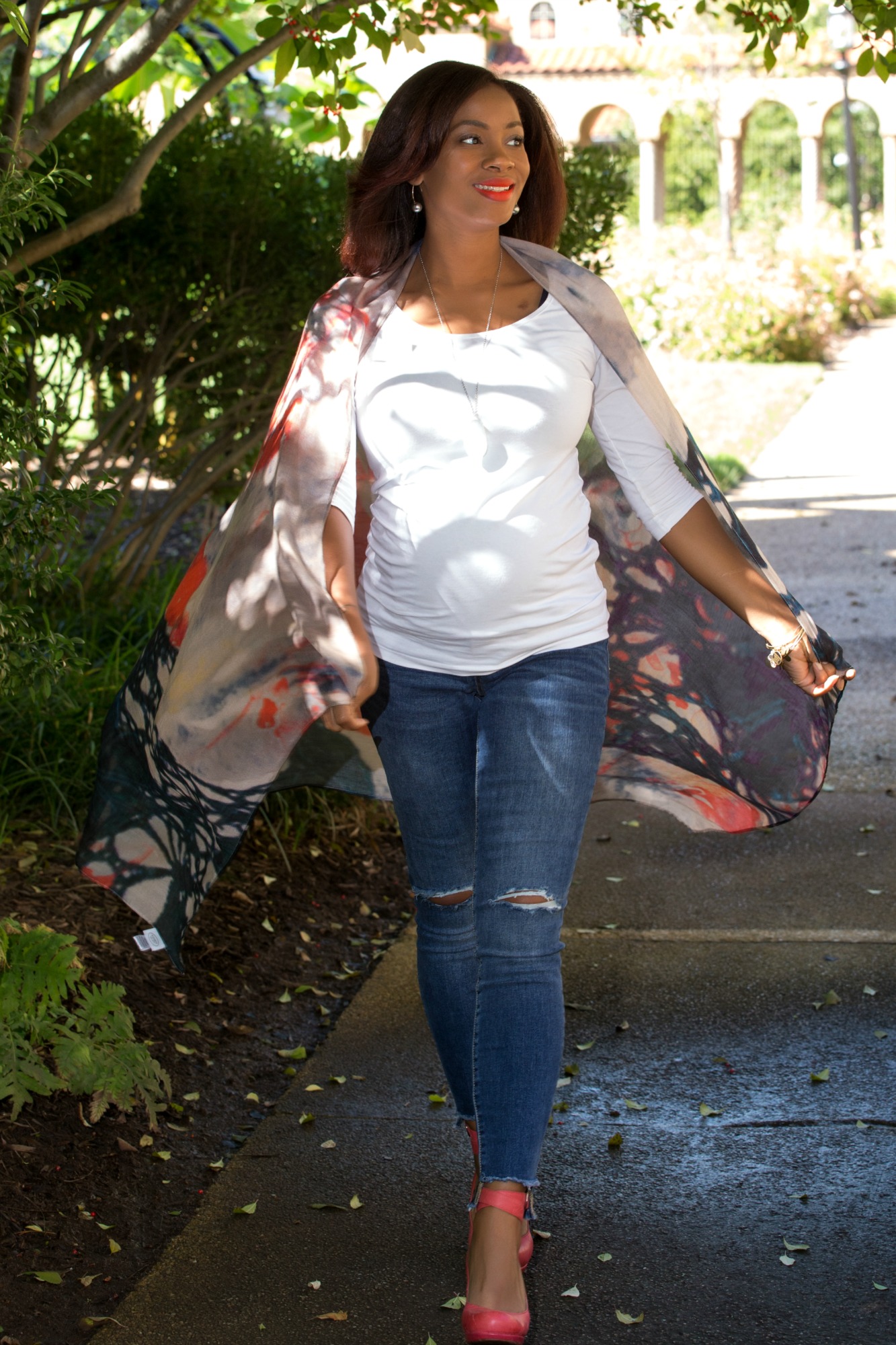 How many of you reading this own a white tee and a pair of jeans? Better yet, how many white tees and pairs of jeans do you own? Next question…how many times do you say, “I don’t have anything to wear!” If you’re anything like me you’ve said this statement more than once or twice…this month! Since I’ve been preggo having nothing, or not much I should say, to wear, is actually a true statement. I couldn’t go out and buy a new maternity wardrobe so I’ve had to make do with some basics, and what’s more basic than jeans and a tee? Not much. That’s why I have 3 pairs of maternity jeans from Target and several white tees from H&M and they’ve become my go-to outfit. How do I keep from looking the same every time I wear said jeans and tee? I add a scarf. The scarf, which I have always been a huge fan of especially in the Fall/Winter months, (I’ve blogged about it before just type “scarf” into my search bar) has become even more of a prized fashion possession during this 9 month transition. I keep several by the door and cling to whichever becomes the scarf of the day while I’m out. I’m definently a “scarfie”. 🙂