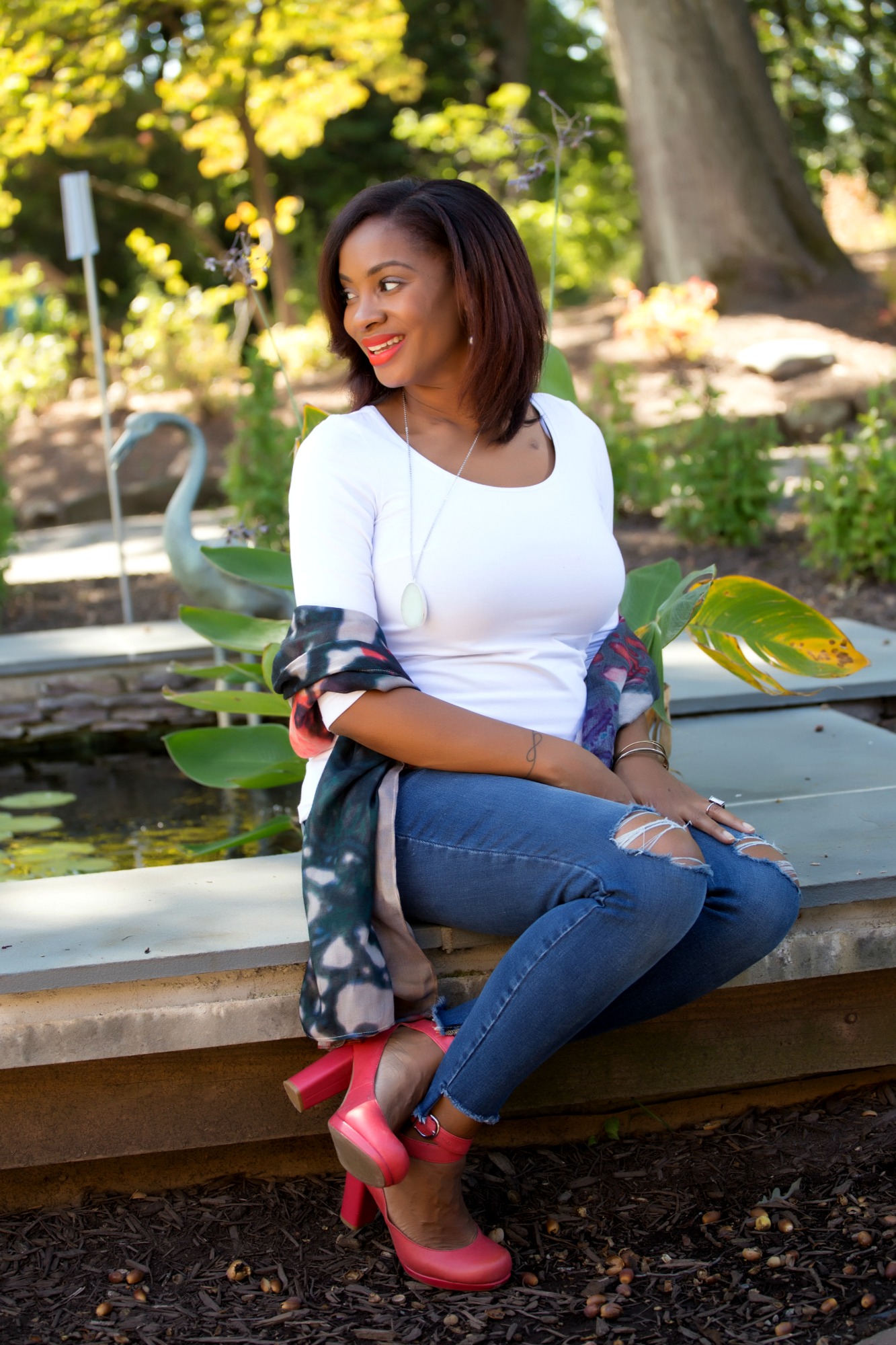 Elizabeth Gillett offers a wonderful array of watercolor hand-designed scarves to choose from and she sent me this “REBECCA red” from her fall scarf collection that I fell all the way in love with. I paired it with some throwback block heel Sam Edelman’s and it was a look. An easy look! You’ve got to check her out at ElizabethGillett.com.