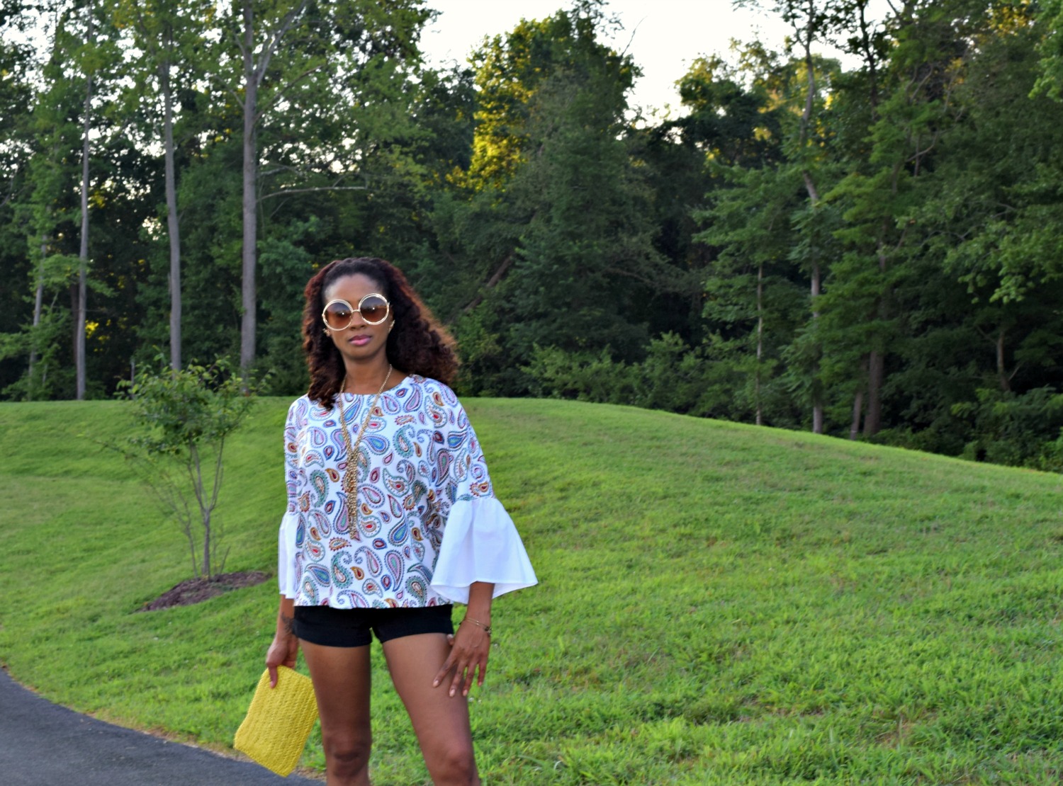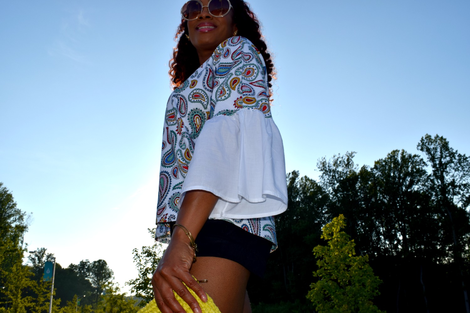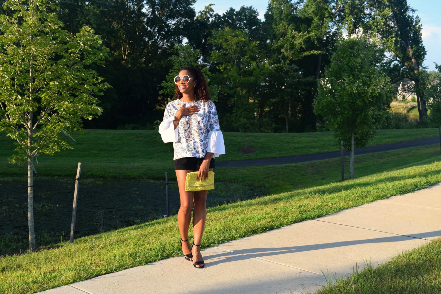 I paired the top with black shorts, ankle heels, a yellow bag for a touch of color, a long gold necklace and over-sized round sunnies. This is a look for date night, girls night, or any outing where you are planning on having a lot of fun! To carry it into the colder months it will also pair well with skinny jeans or tapered pants.