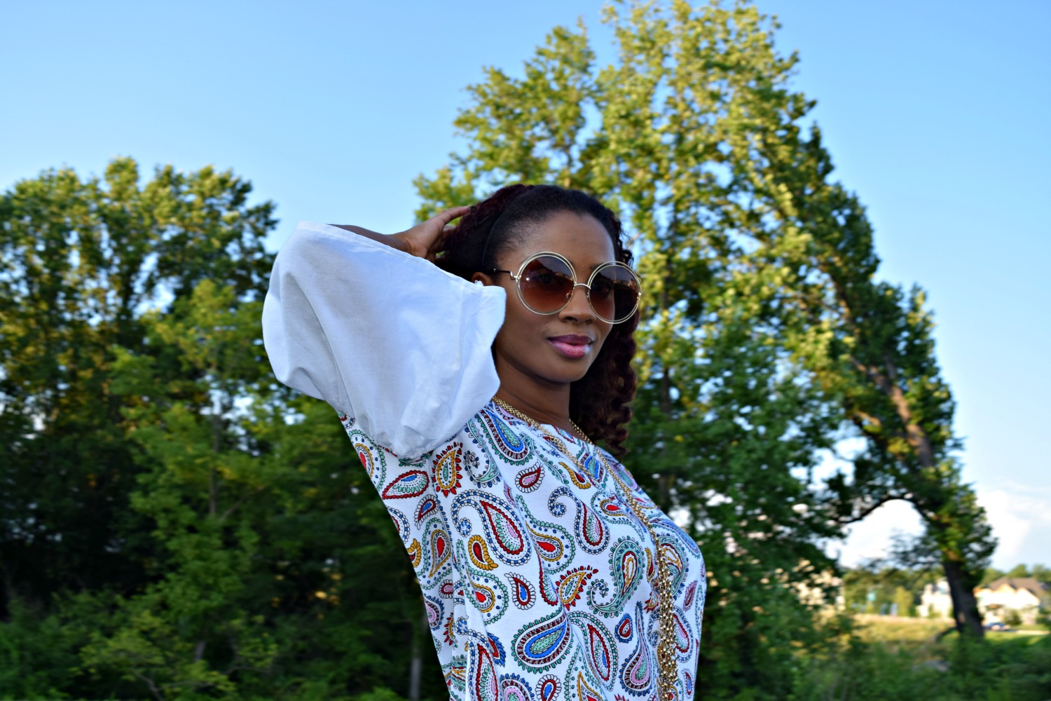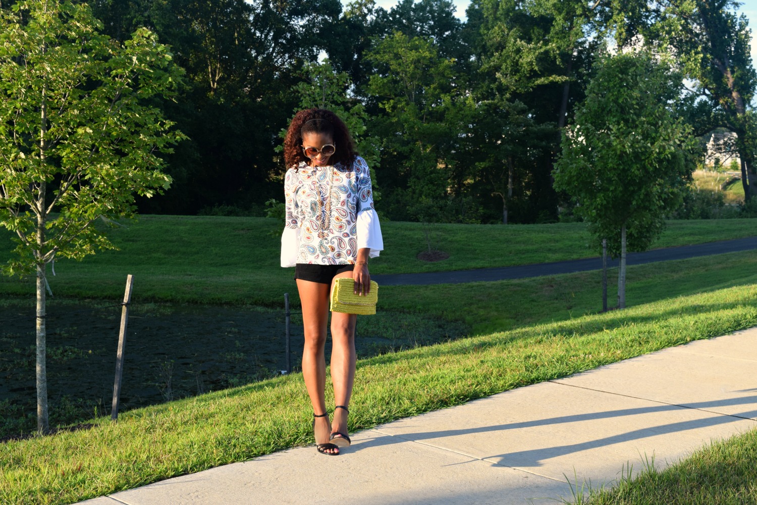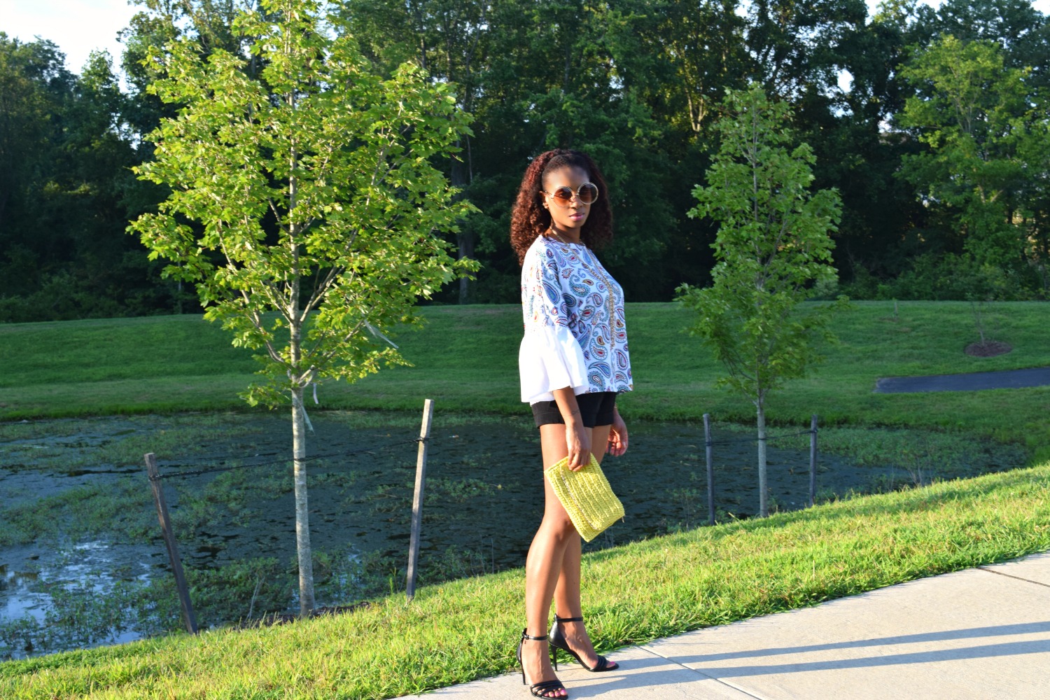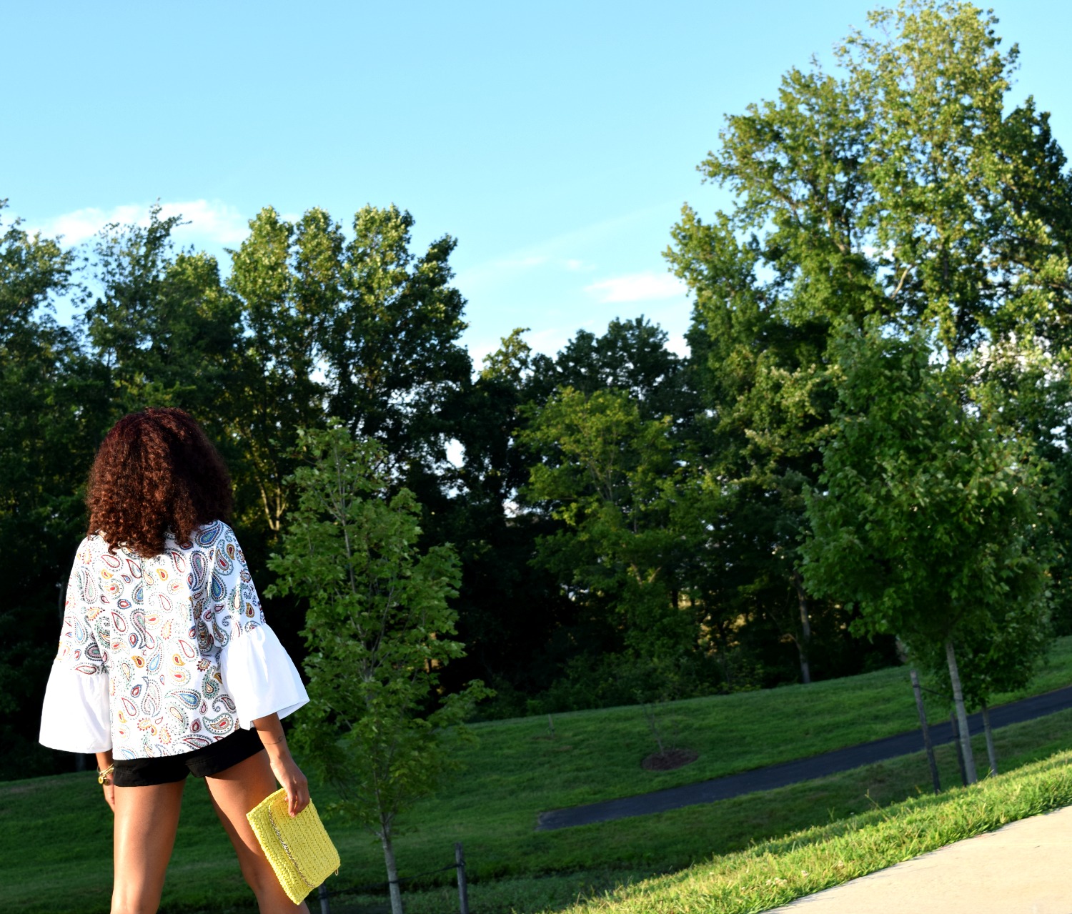 I paired the top with black shorts, ankle heels, a yellow bag for a touch of color, a long gold necklace and over-sized round sunnies. This is a look for date night, girls night, or any outing where you are planning on having a lot of fun! To carry it into the colder months it will also pair well with skinny jeans or tapered pants.