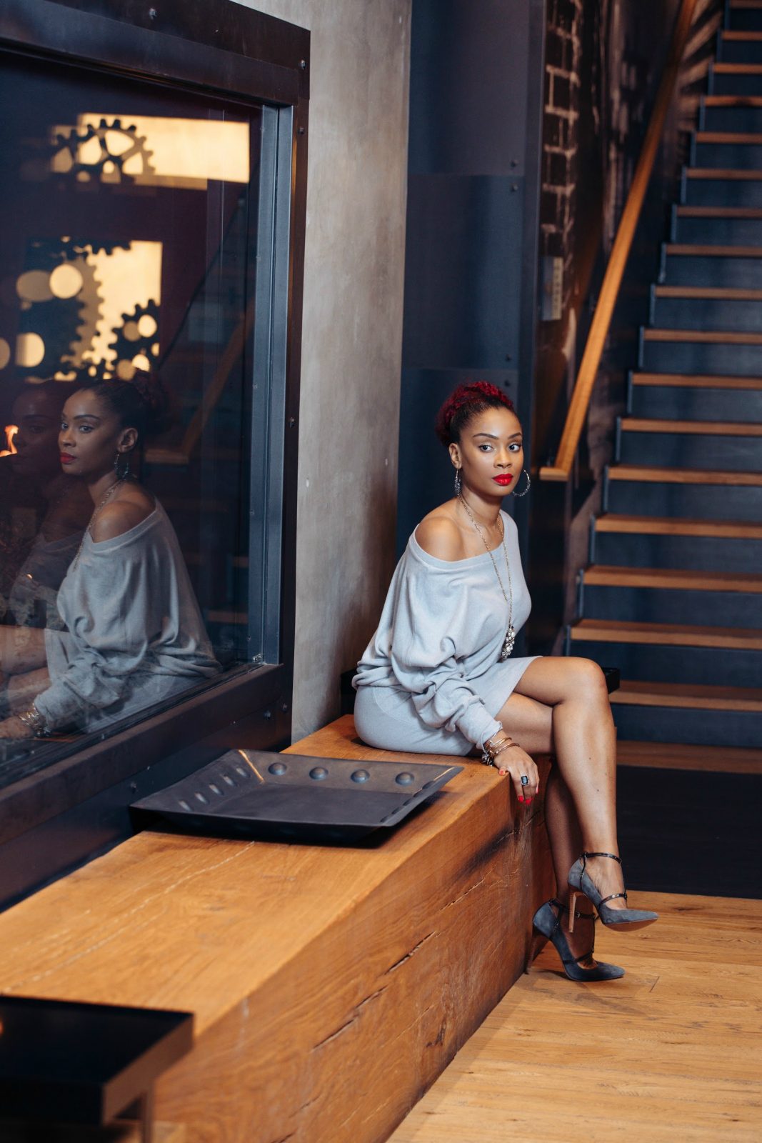 I went full monochrome with this $20 dress from Forever 21. It’s a soft brushed knit off the shoulder dress in heather grey. I paired it with some grey heels that I’ve had for a while that will never go out of style. Grey heels are an entire mood by themselves, don’t you think?