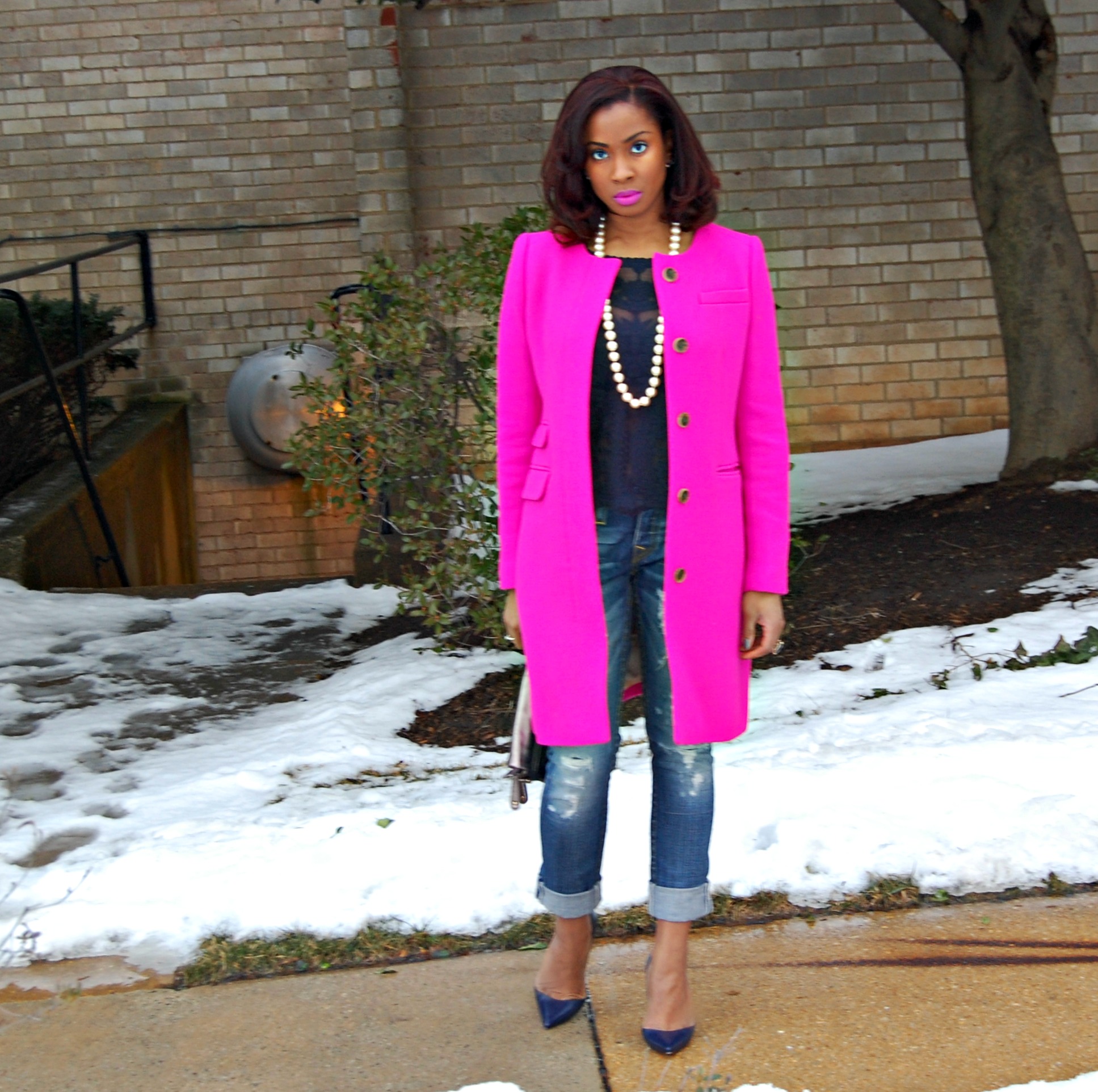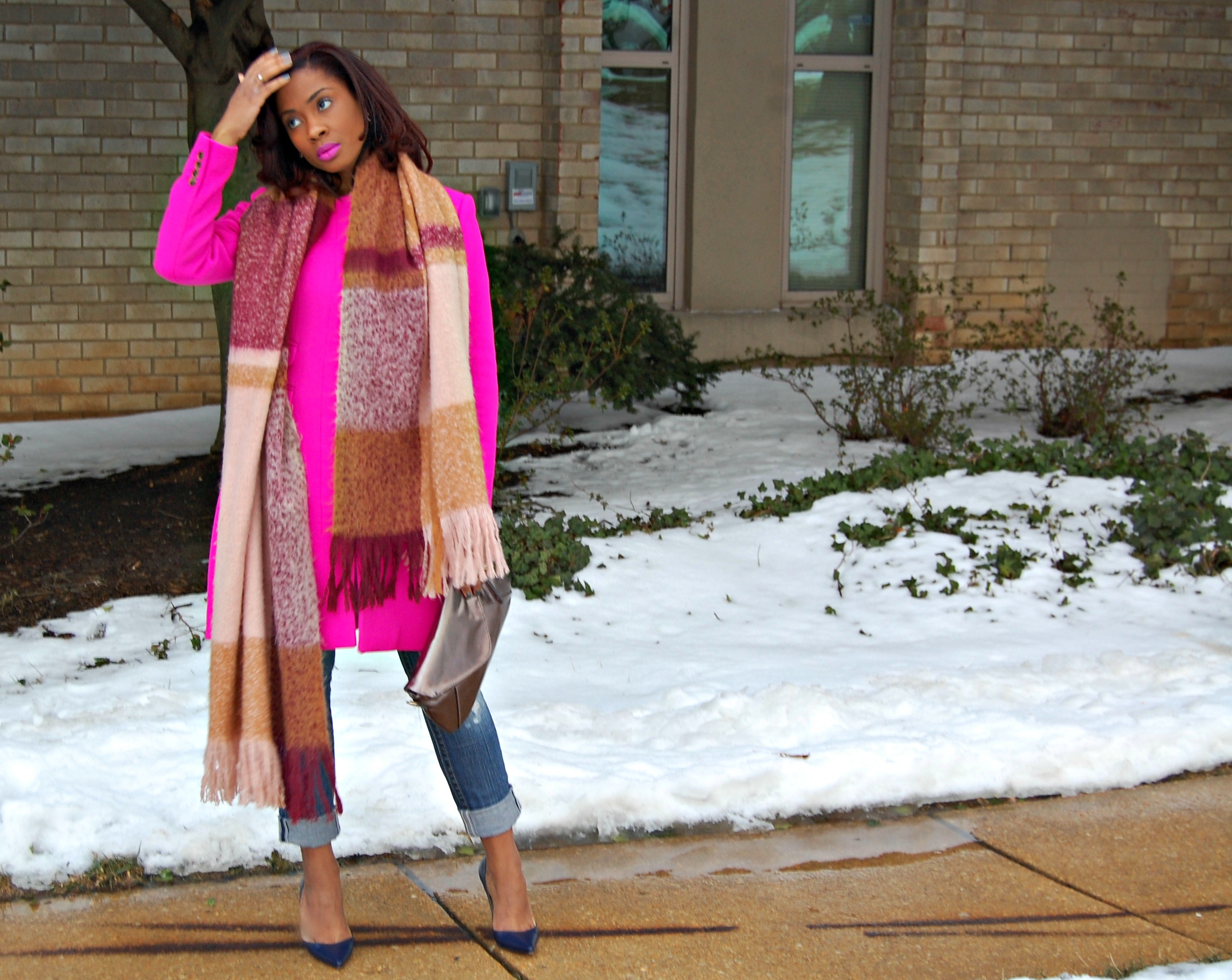If I was to choose a monochromatic look it would be with blue (well I guess you could figure that by this post). Blue is strong – it’s royal while still leaving room for femininity and style. It won’t wash you out. Instead, it may lift you up. Plus it matches everything! I think this color is totally underrated. It’s still cold outside unfortunately but to brighten up the day I wore a fluorescent pink coat from my closet and a thick tartan scarf from H&M earlier this season.