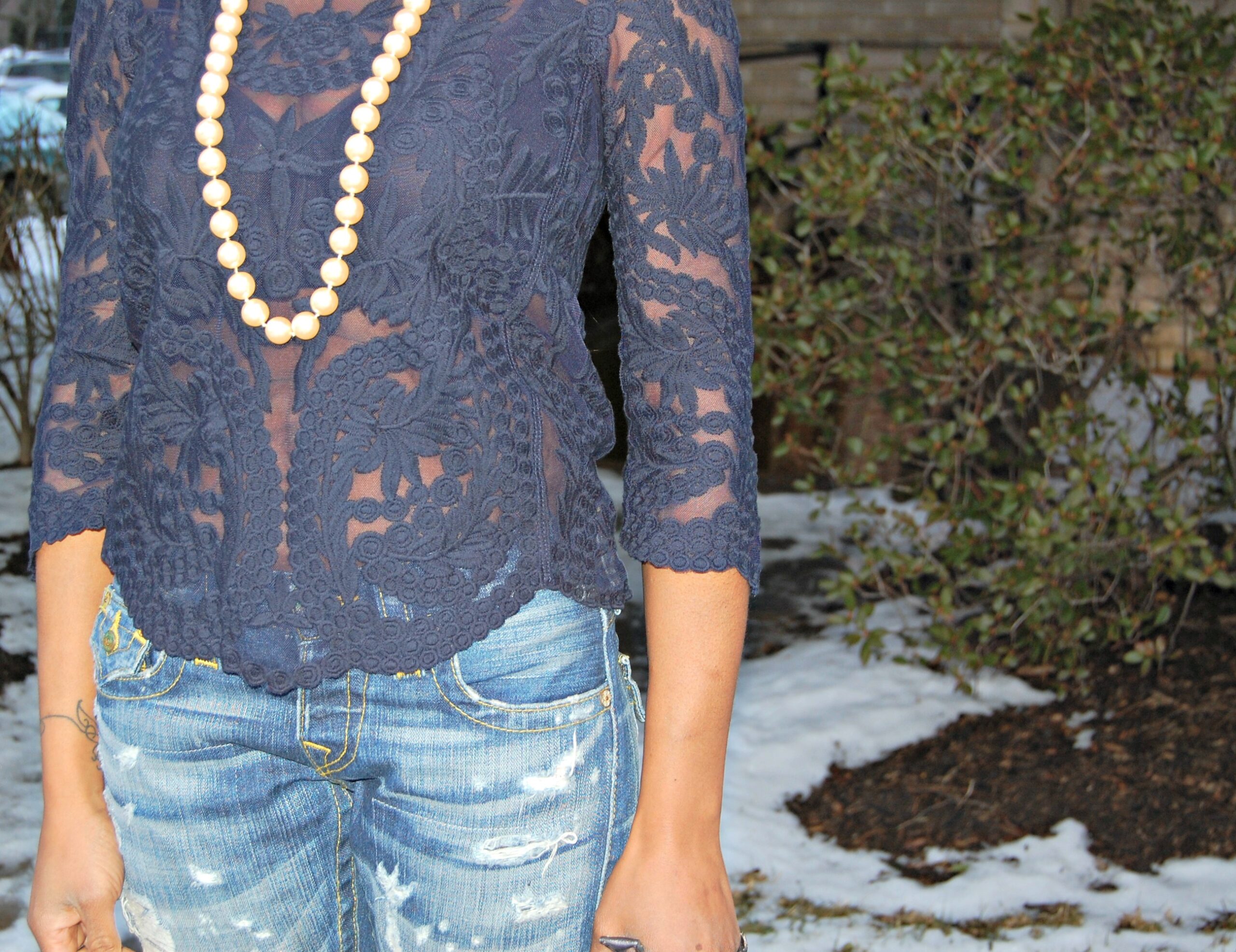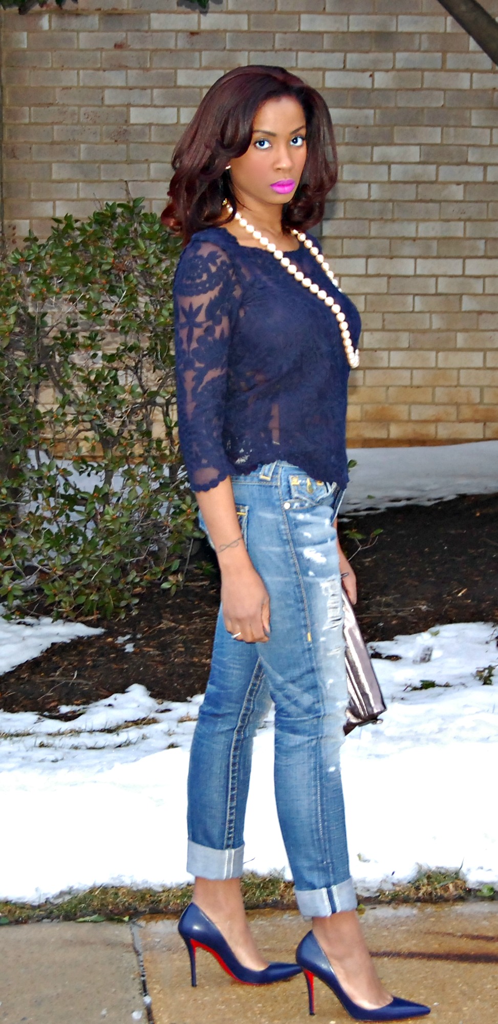 I wore a lace top that I found at H&M for about $7, my best (and only) pair of boyfriend jeans from True Religion that I’ve had at least 3 years now, and my navy blue red sole shoes. I invested in these shoes, absolutely. Mostly because they’re navy blue and they fit my super-wide foot. And because well, I got a new job a few months ago and I felt like I needed new shoes, plus they’re navy as I mentioned before, which is one of my new favorite colors. That pretty much sums up my excuse for buying these too expensive shoes. Now, let’s move on.
