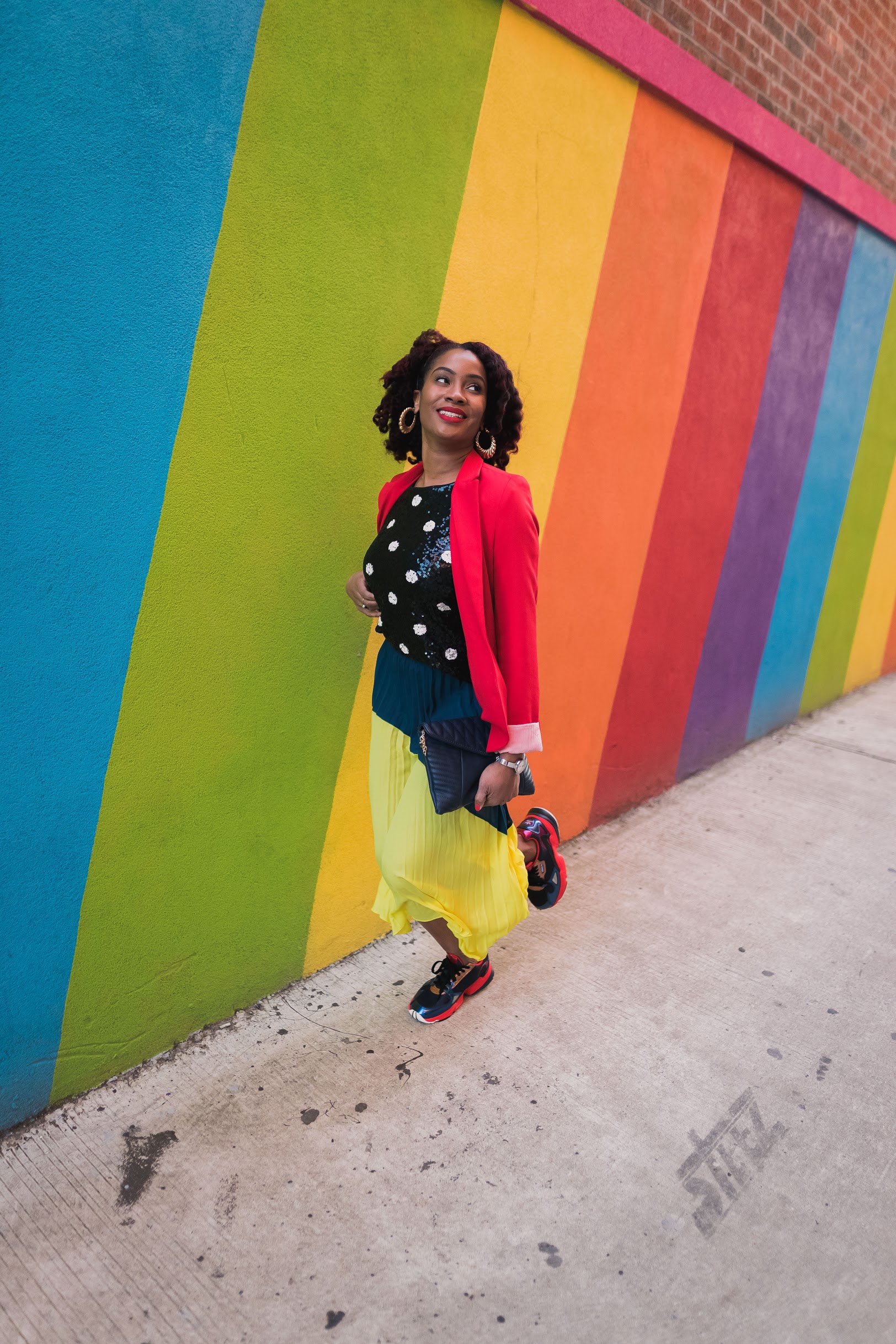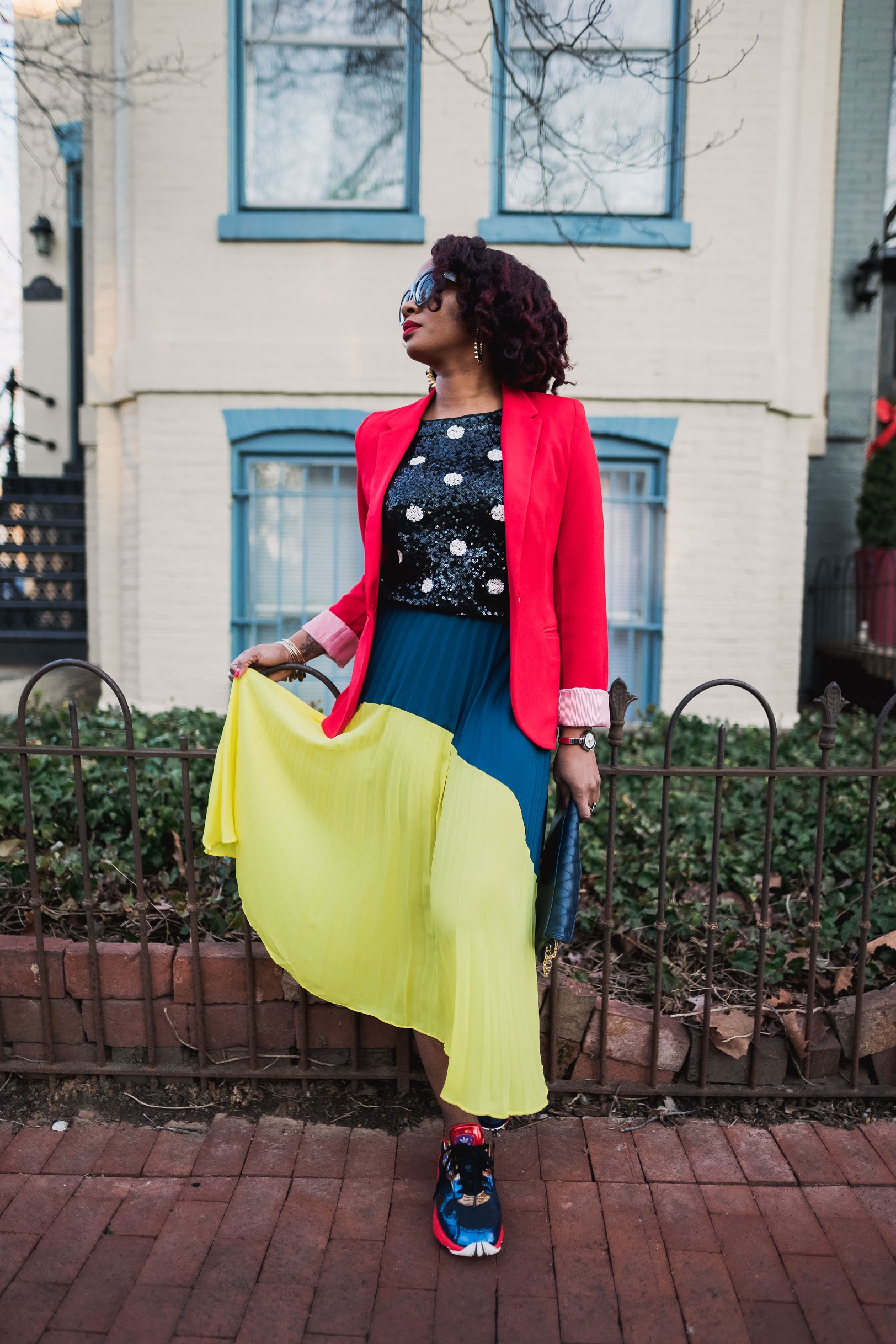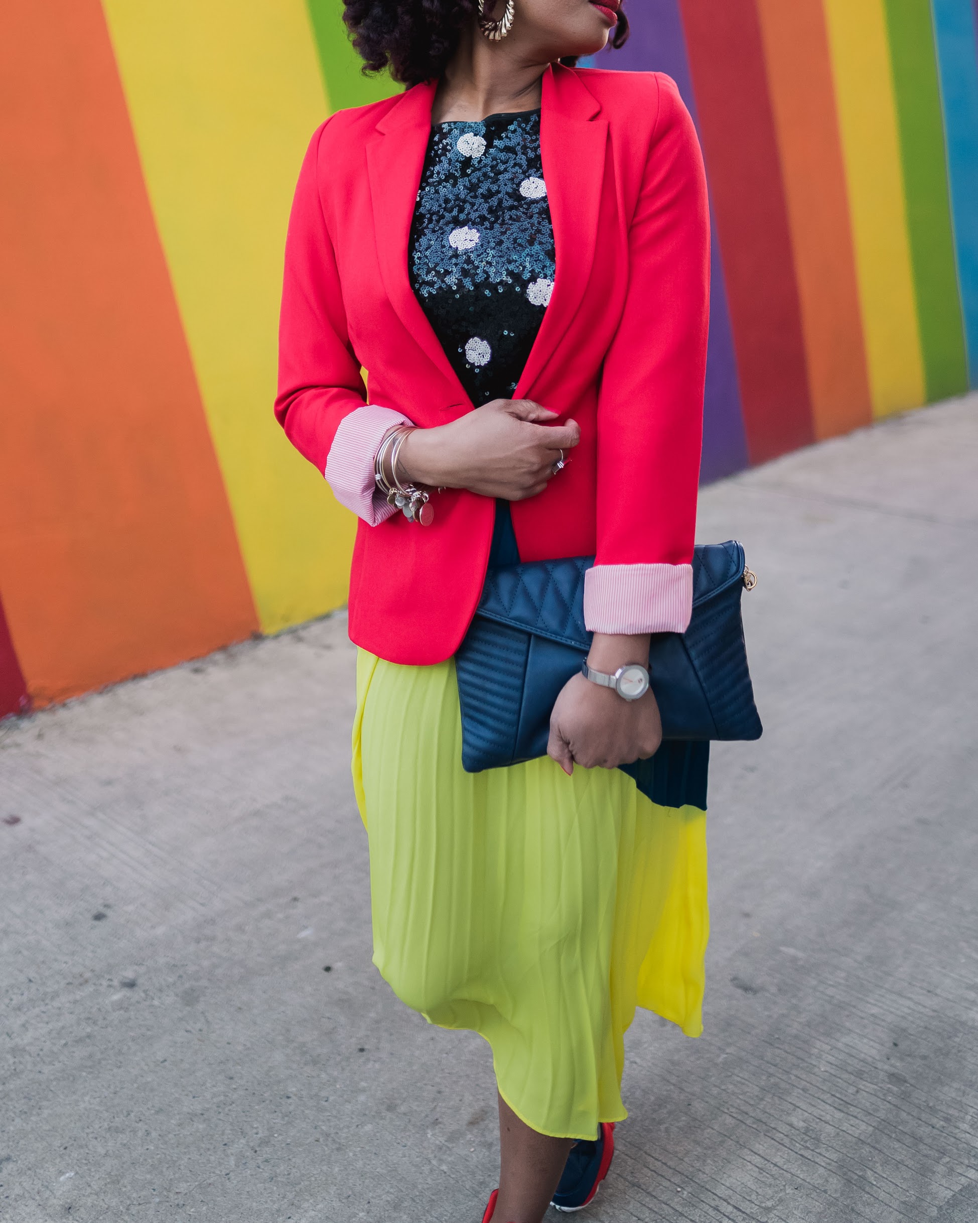 I mixed the colors and patters up with this look and added sneakers to tie it all together. The focus of the look is of course this awesome color blocked skirt with the best color ever (yellow) and another fave color (blue). I told y’all in my last post, color is my go-to this spring so let’s mix things up! Polka dot is kinda like a color and it’s the best friend of all bright colors. 🙂