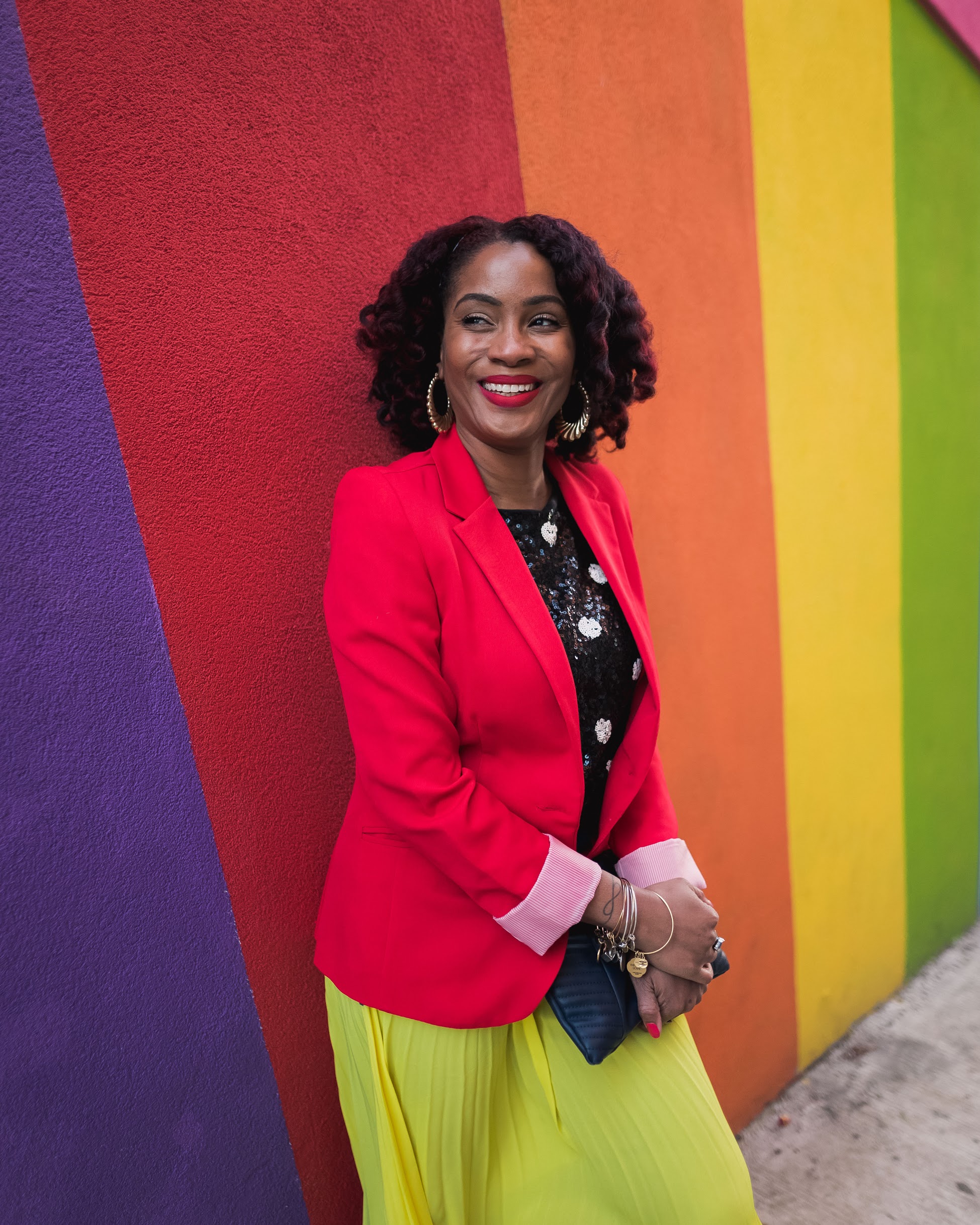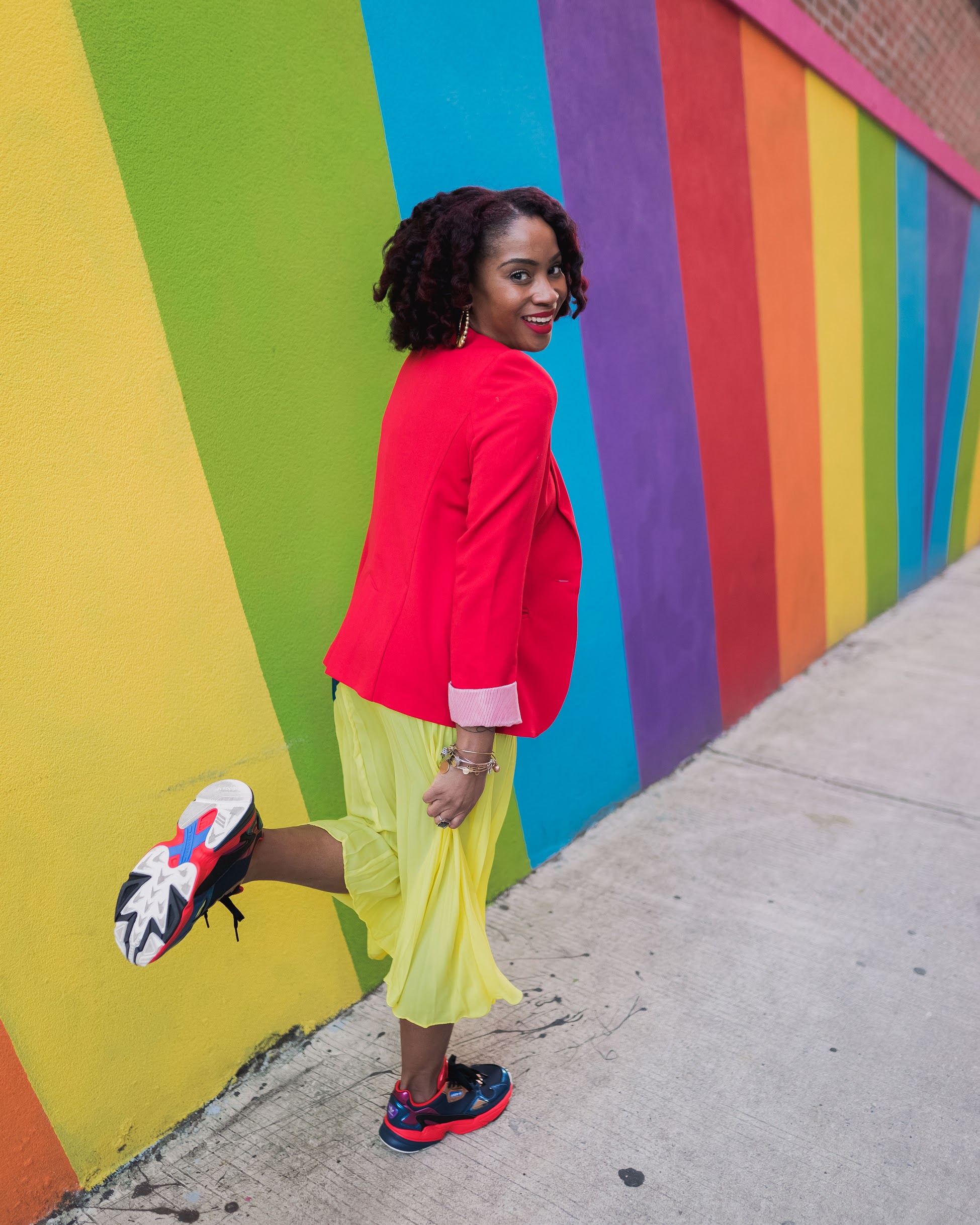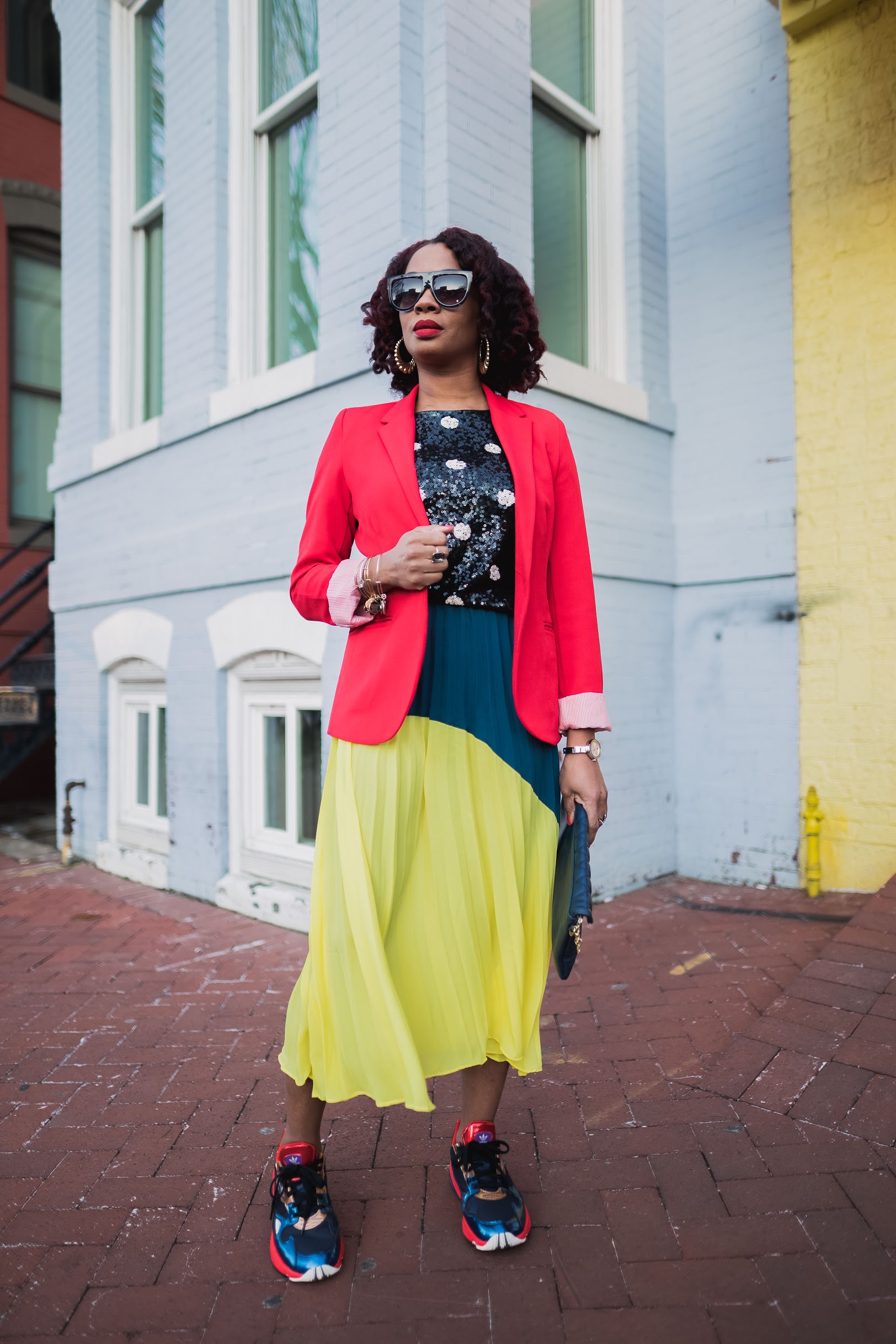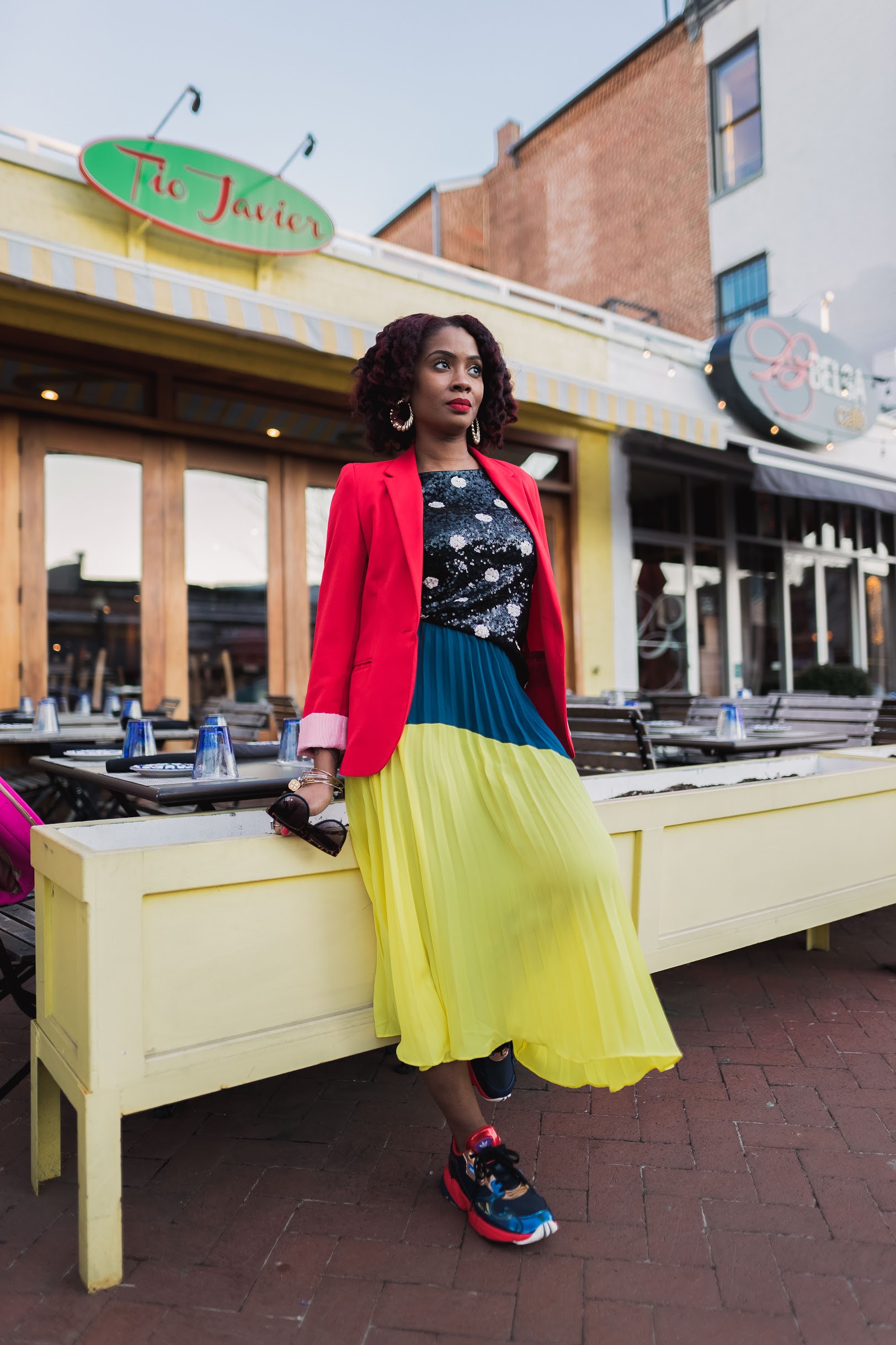 I mixed the colors and patters up with this look and added sneakers to tie it all together. The focus of the look is of course this awesome color blocked skirt with the best color ever (yellow) and another fave color (blue). I told y’all in my last post, color is my go-to this spring so let’s mix things up! Polka dot is kinda like a color and it’s the best friend of all bright colors. 🙂