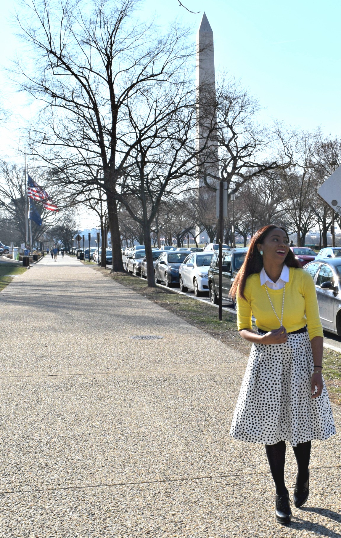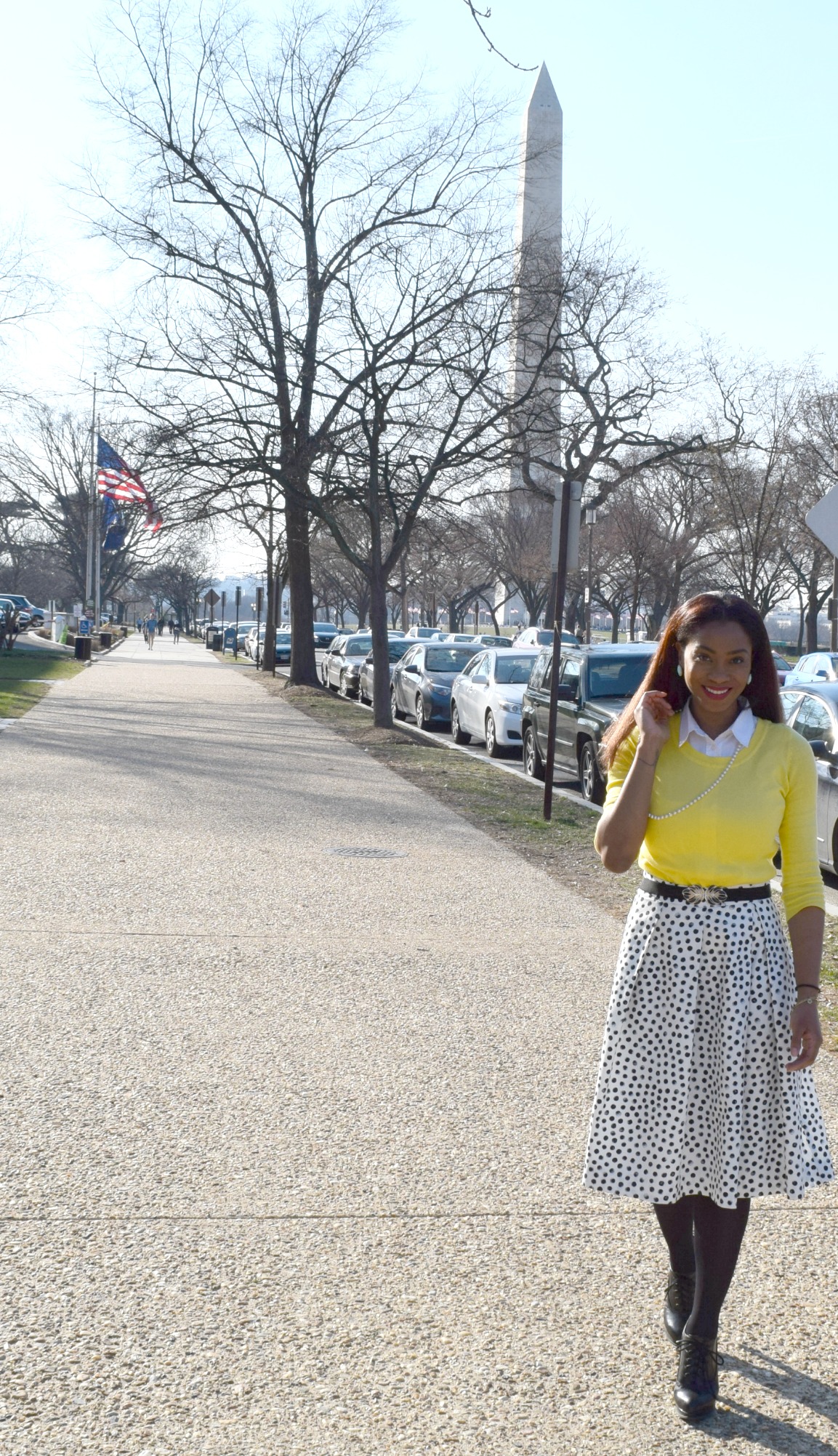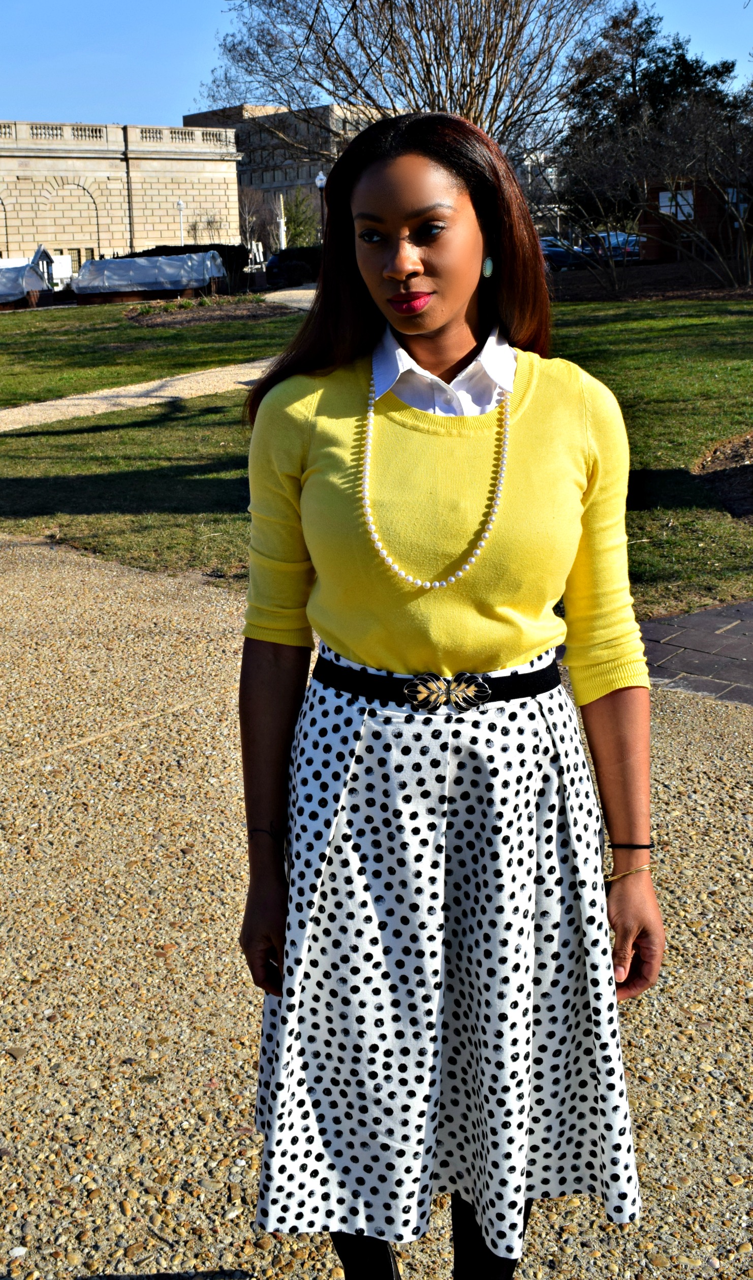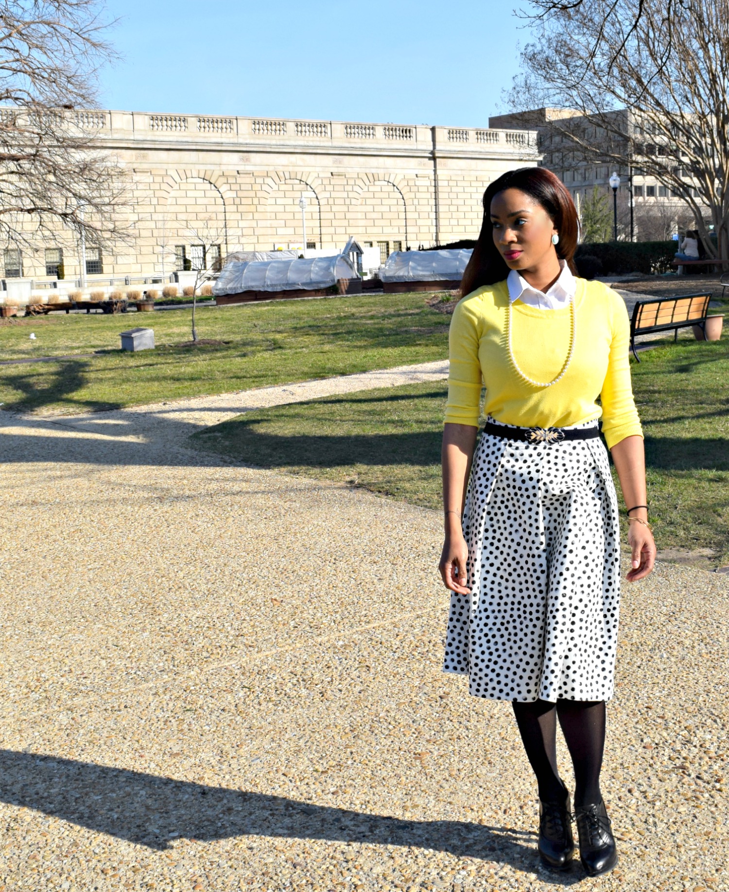 My second breakout springtime look encompasses around bright colors and patterns, such as this yellow sweater over a collar shirt and polka-dot โBirdcage Skirtโ from Targetโs recent Who What Wear collection. I loved the fit and fabric of the skirt by the way. The only thing missing is pockets, which is one of the best things a skirt can have!