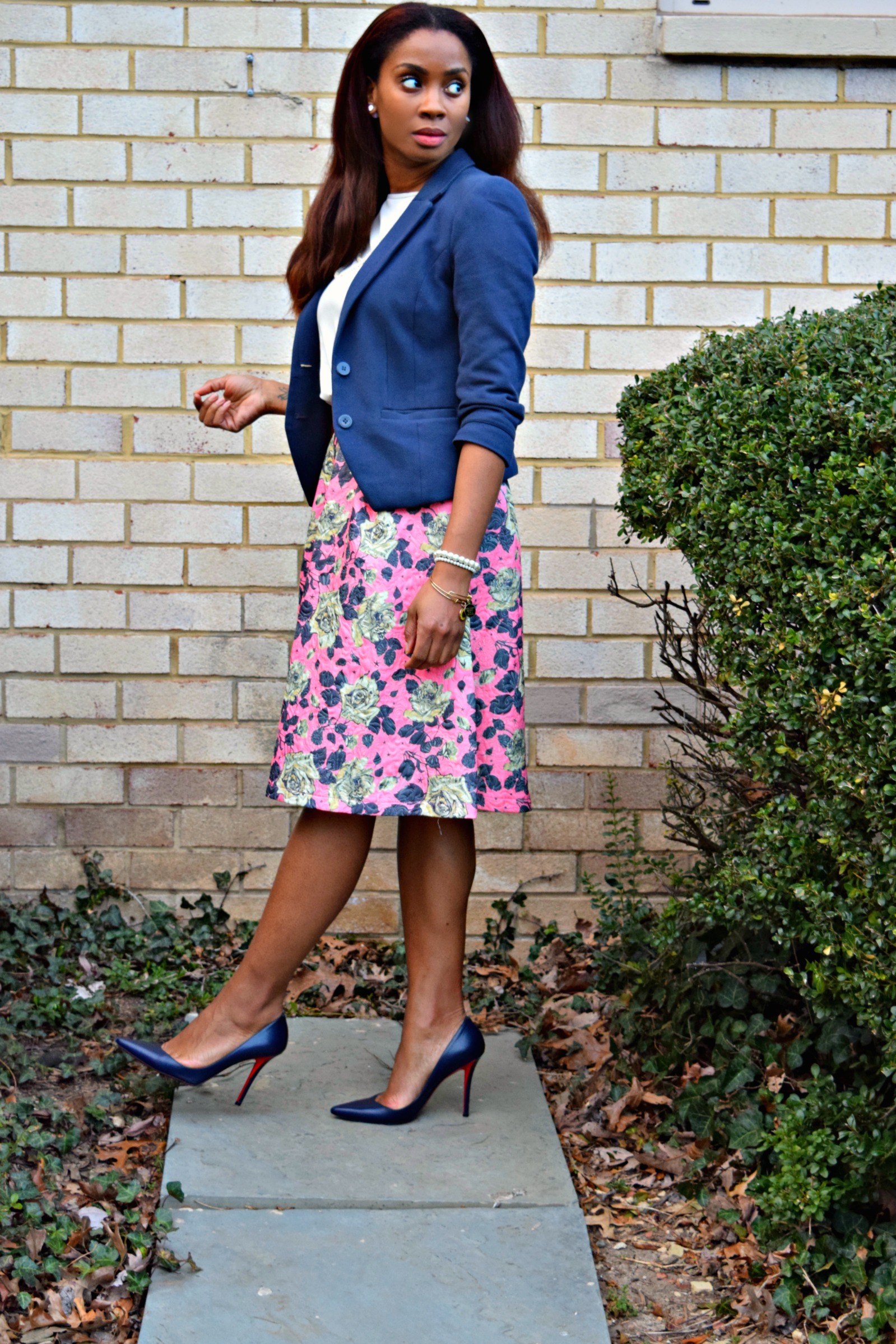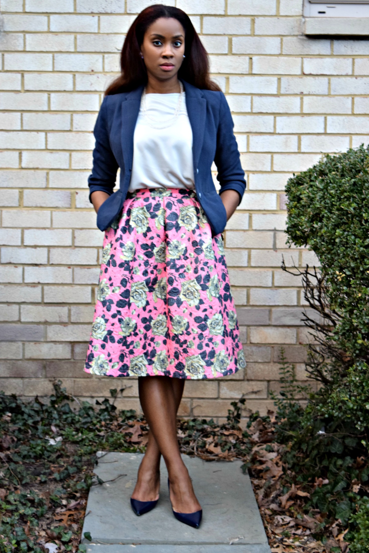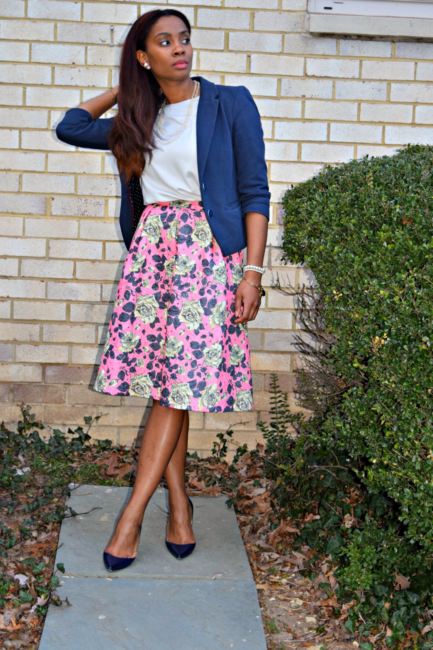In my first look, this bright colored floral skirt is made less overwhelming while remaining the focal piece with a simple top, minimal accessories and navy blazer and shoes.