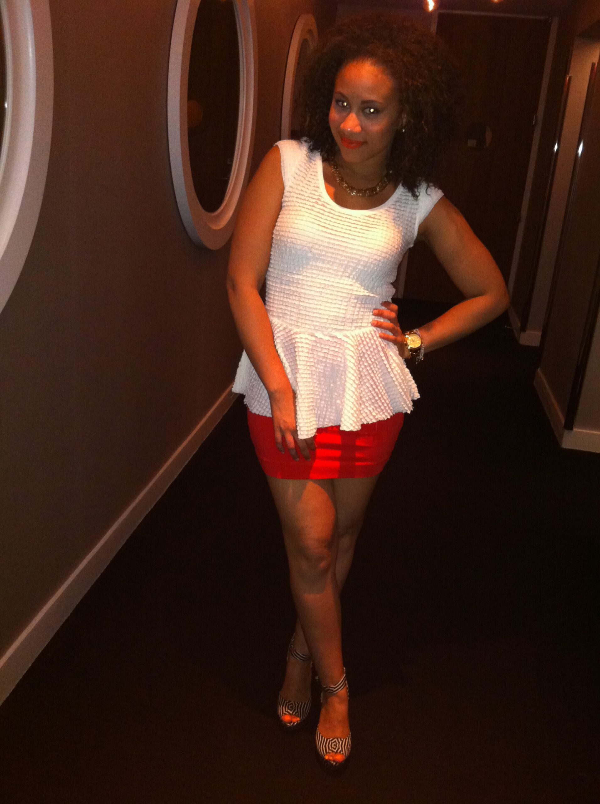 Cruise Dinner Wear: White peplum top and fitted hot orange skirt paired with a patterned ankle strap pump. Yup!