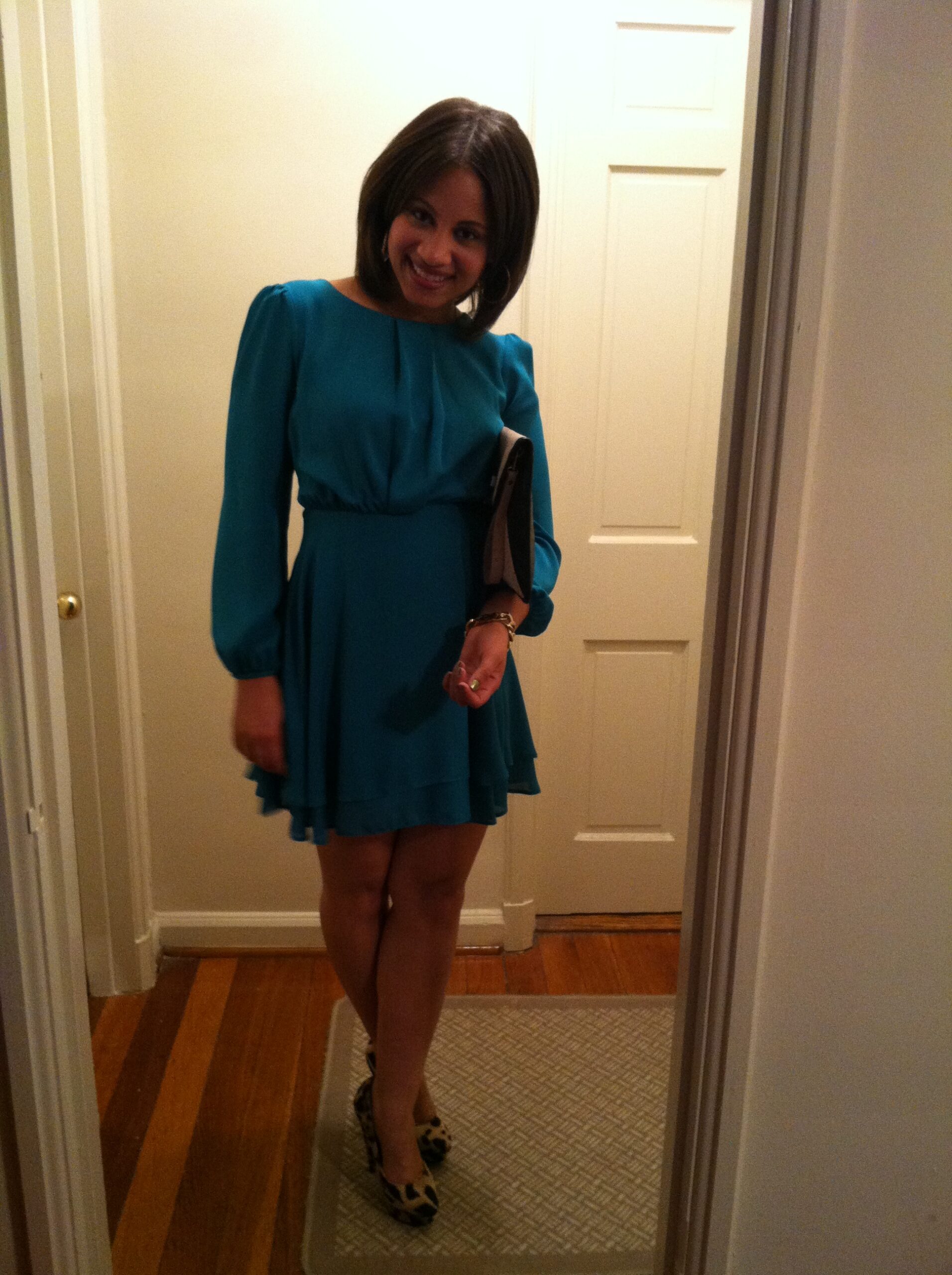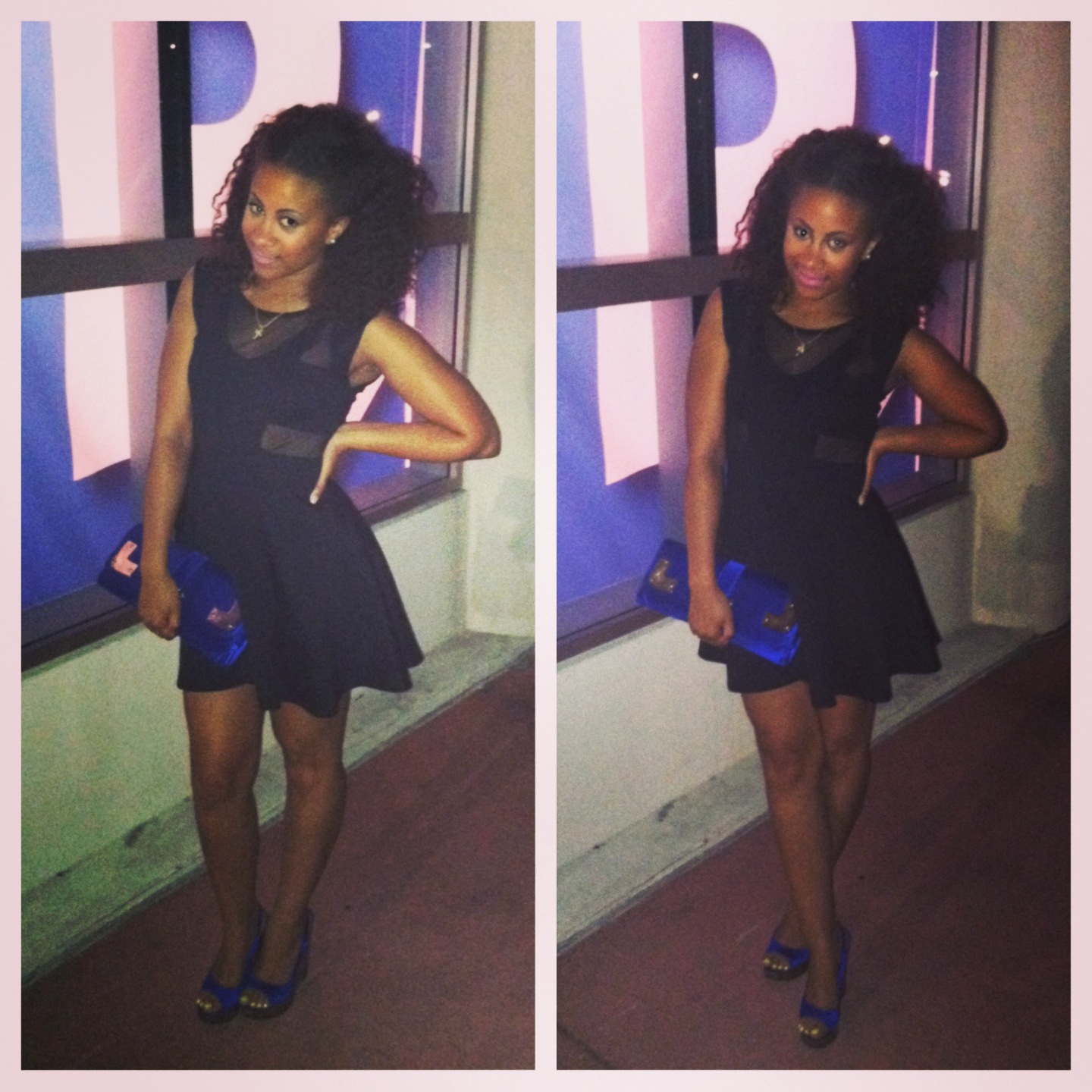 This LBD with mesh cut outs paired with electric blue accessories is sweet! But what really sets this look apart are the pink lips. Super cute!
