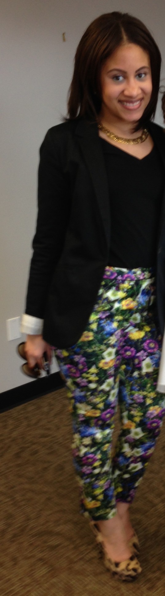 Bottom Mixer: Basic black tee and blazer, floral pants and leopard pumps. Original combination for a party on the bottom!