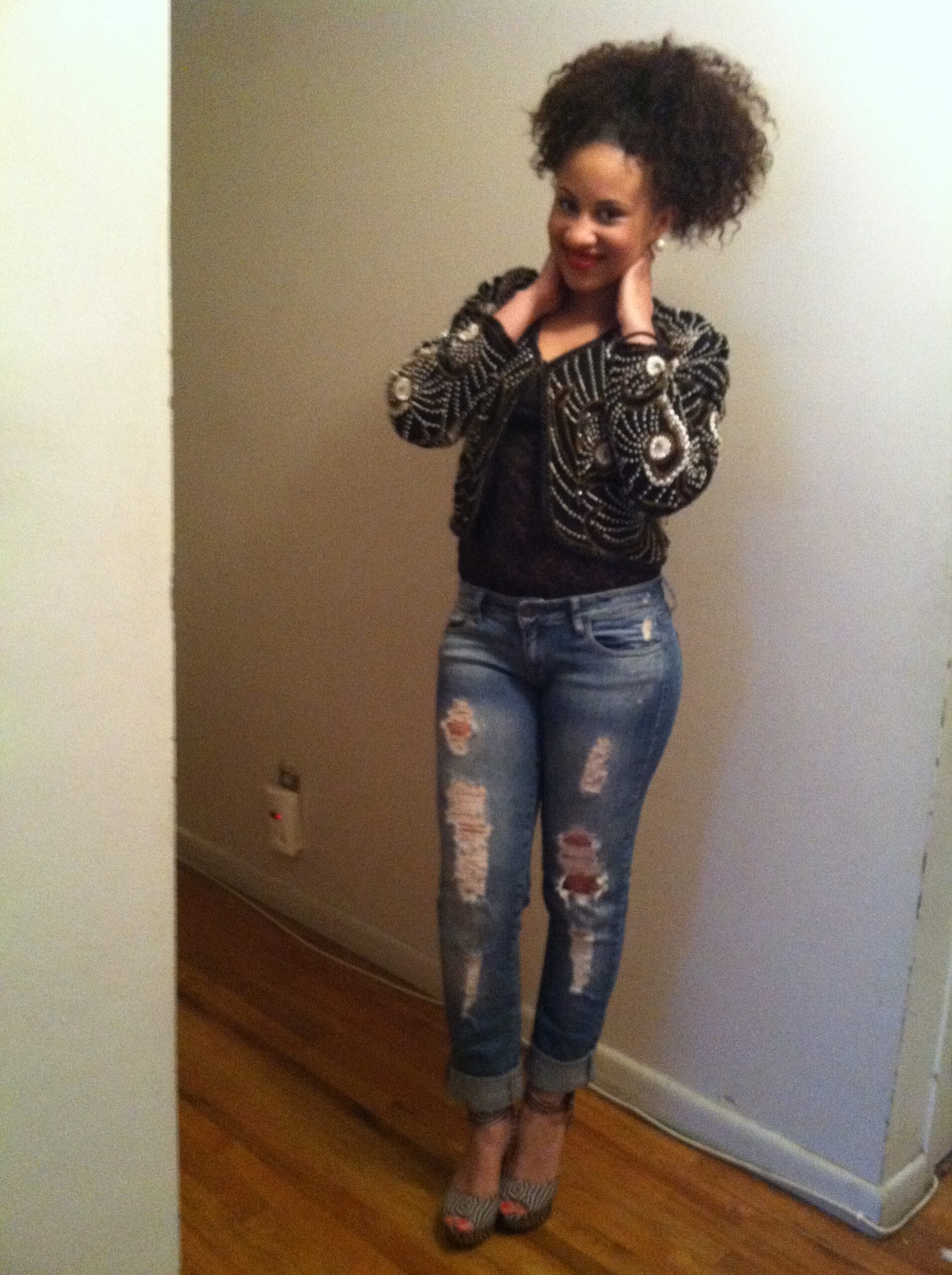 Embroidered jacket, paired with a simple black tank and skinny destroyed denim with nude and black printed wedges. Concert ready!