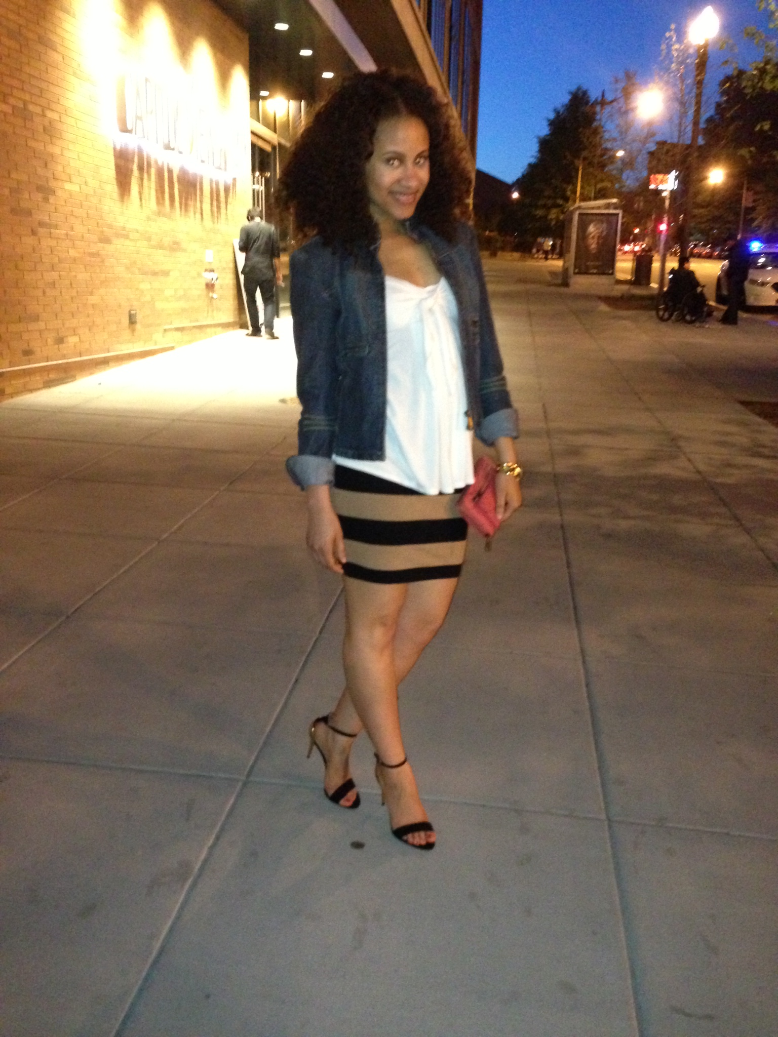 This look is very clean and simple. The striped skirt adds flavor to the simple flowy white top and denim jacket, and the look gets simple again on the bottom. Very balanced look. Stamp.