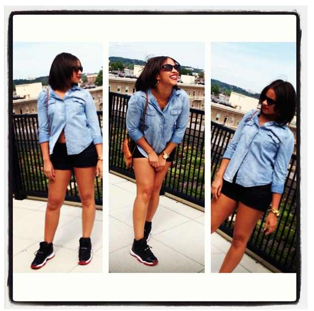 A musical festival type of day. Jordans, shorts, and denim shirt.