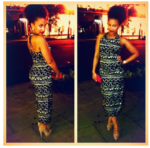 T-Back fitted black ethnic design long dress, with nude stilettos. Red clutch. Yes!