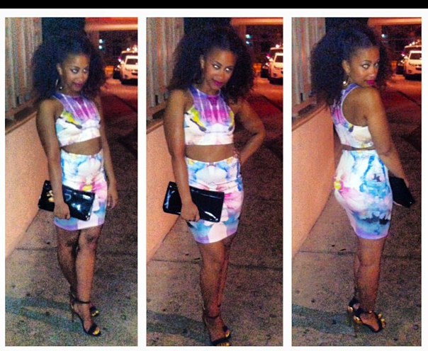 This two piece multi-colored look is right on time this summer. I love the water-colored like print paired with bright nail polish and black accessories. Look back at it! …at the outfit. Look back at the outfit. hahaha