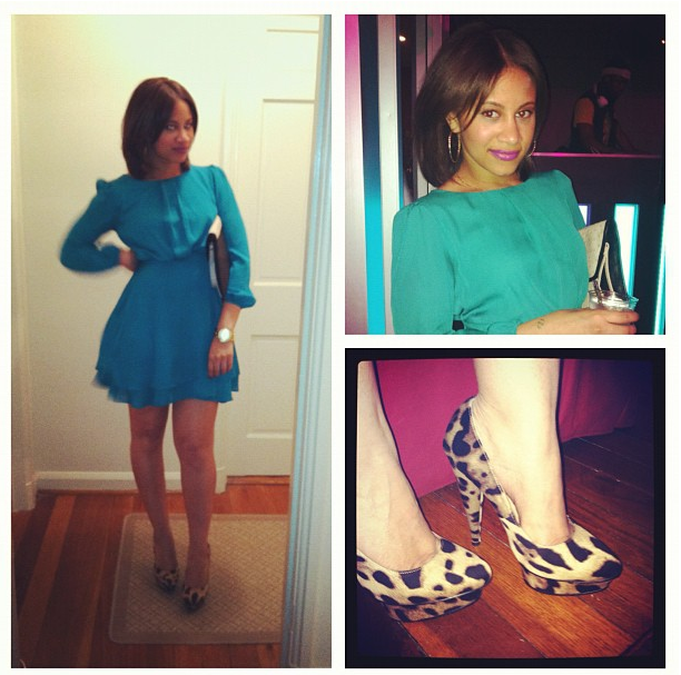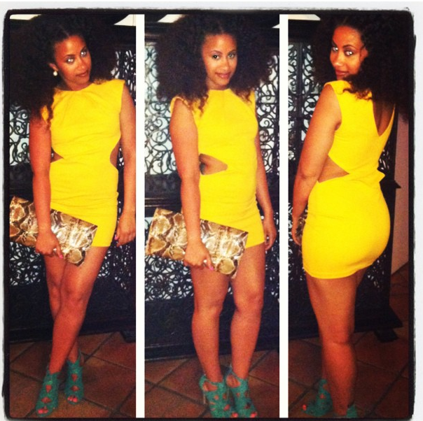 Fire! This outfit is tooo hot! Yellow open-side mini, turquoise cut out heels, and snakeskin clutch. Staaaamp!