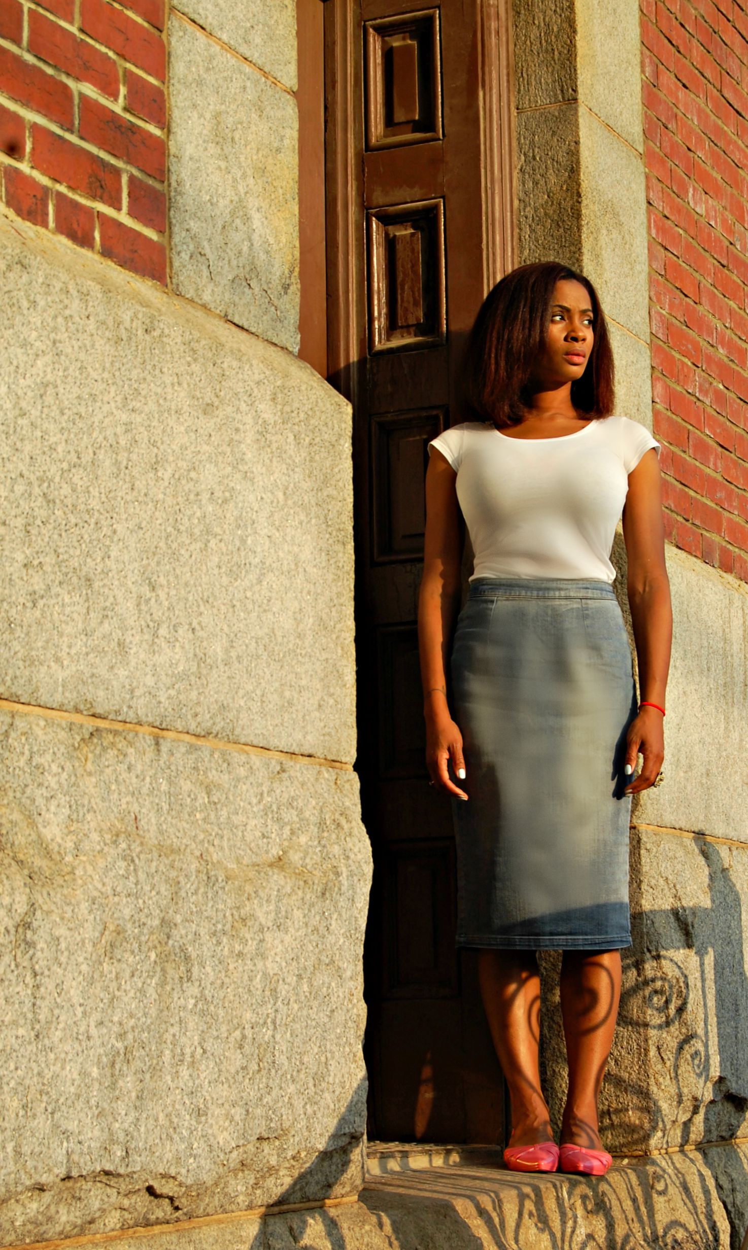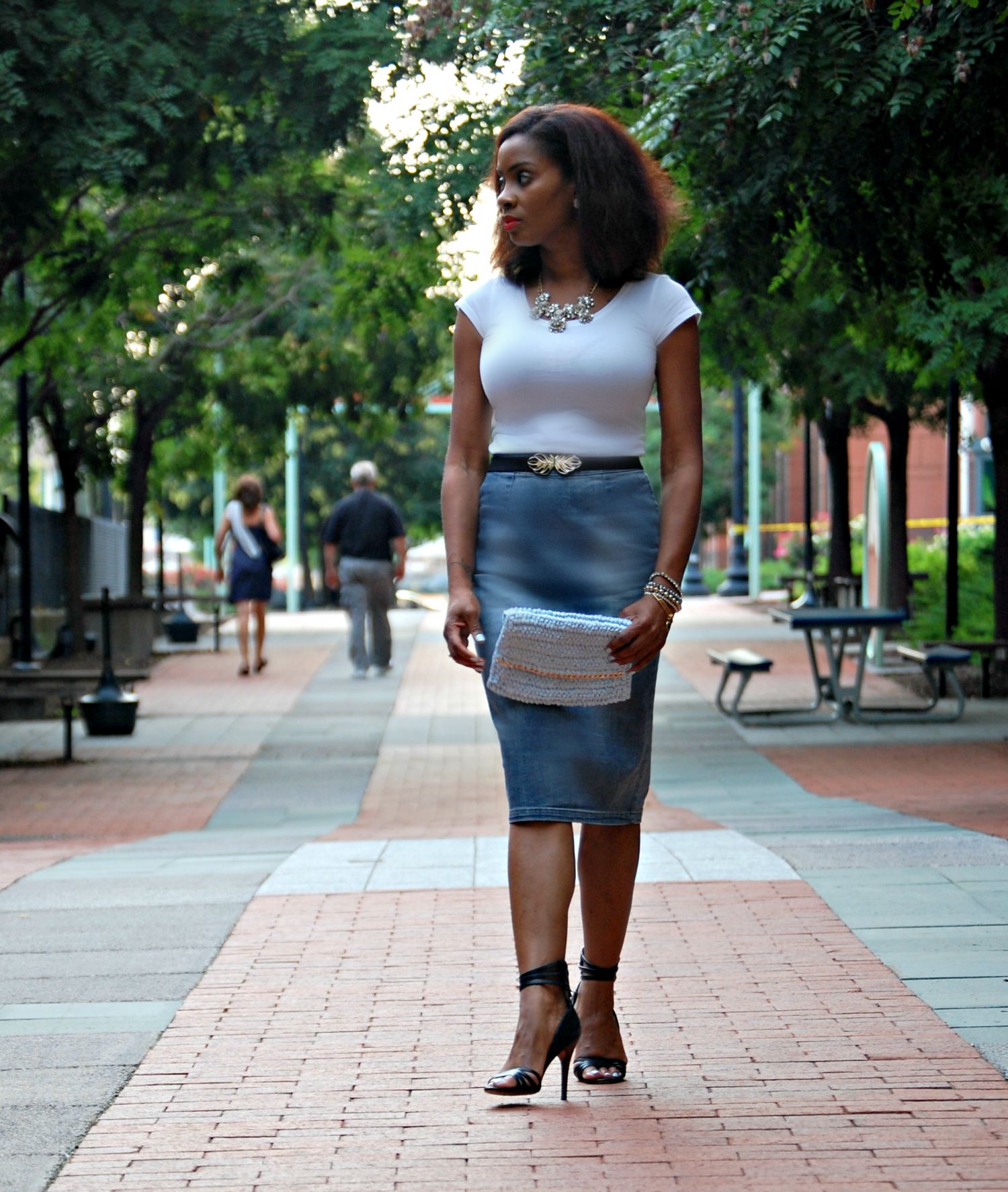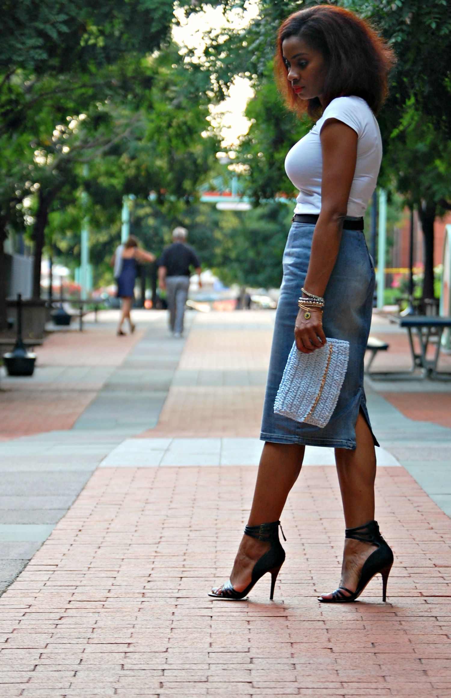 The best outfits are built from basics. A white tee and denim are the most classic basics that you and everyone else will find in their closets. Don’t underestimate the power of basics! Here we bring you a classic, streamlined look with a white tee and a midi denim pencil skirt with flats. This is a standard look with no frills, good for a walk in the park. It’s the plain look of a “girl next door.”