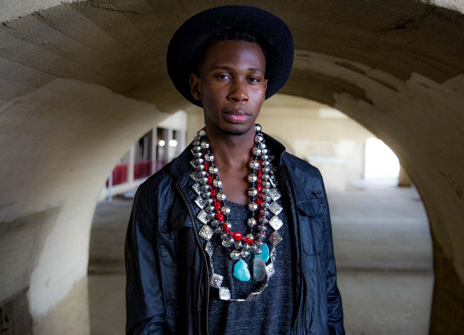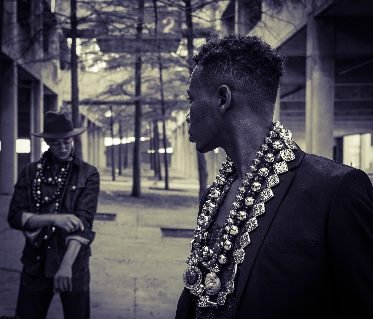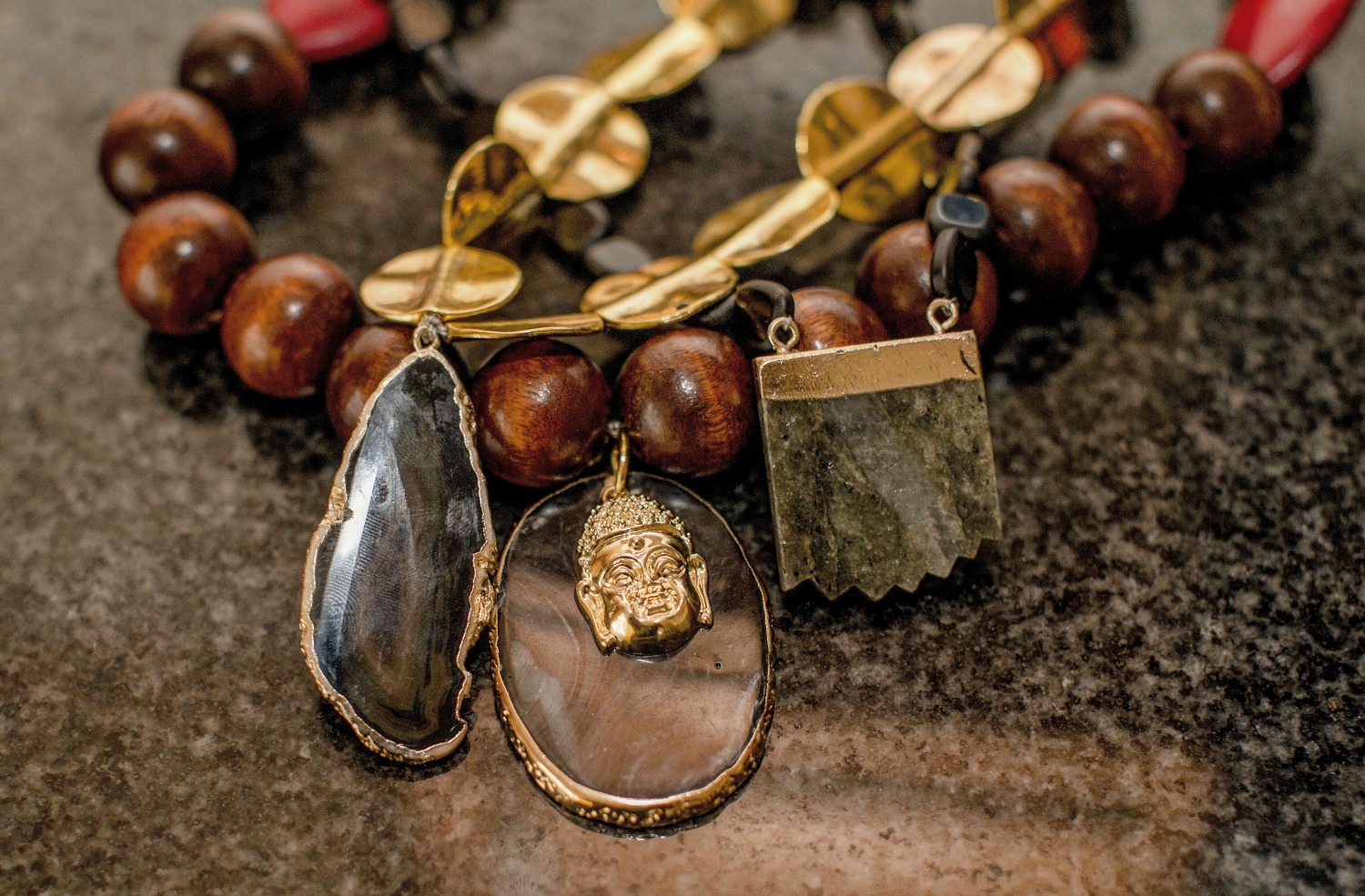 The collection of neck-wear is inspired by different cultures and regions of the world which the basis behind the EthniCITY name. As a designer from a large city, Desmond studies street style while in his own native area of Washington, DC and through his travels across the U.S. from New York to Atlanta to L.A. While traveling to urban settings which are so full of fashion and culture, Desmond gets a feel of what the urban man likes. This study of style becomes the inspiration for his designs. To decipher the “ethnic” piece of the brand’s name, the collection features materials from all over the world including Moroccan beads, metals, marble, stone, turquoise, and wood. The neck-wear is exaggerated and large in size, created with strong natural materials to identify it as a masculine creation of jewelry.