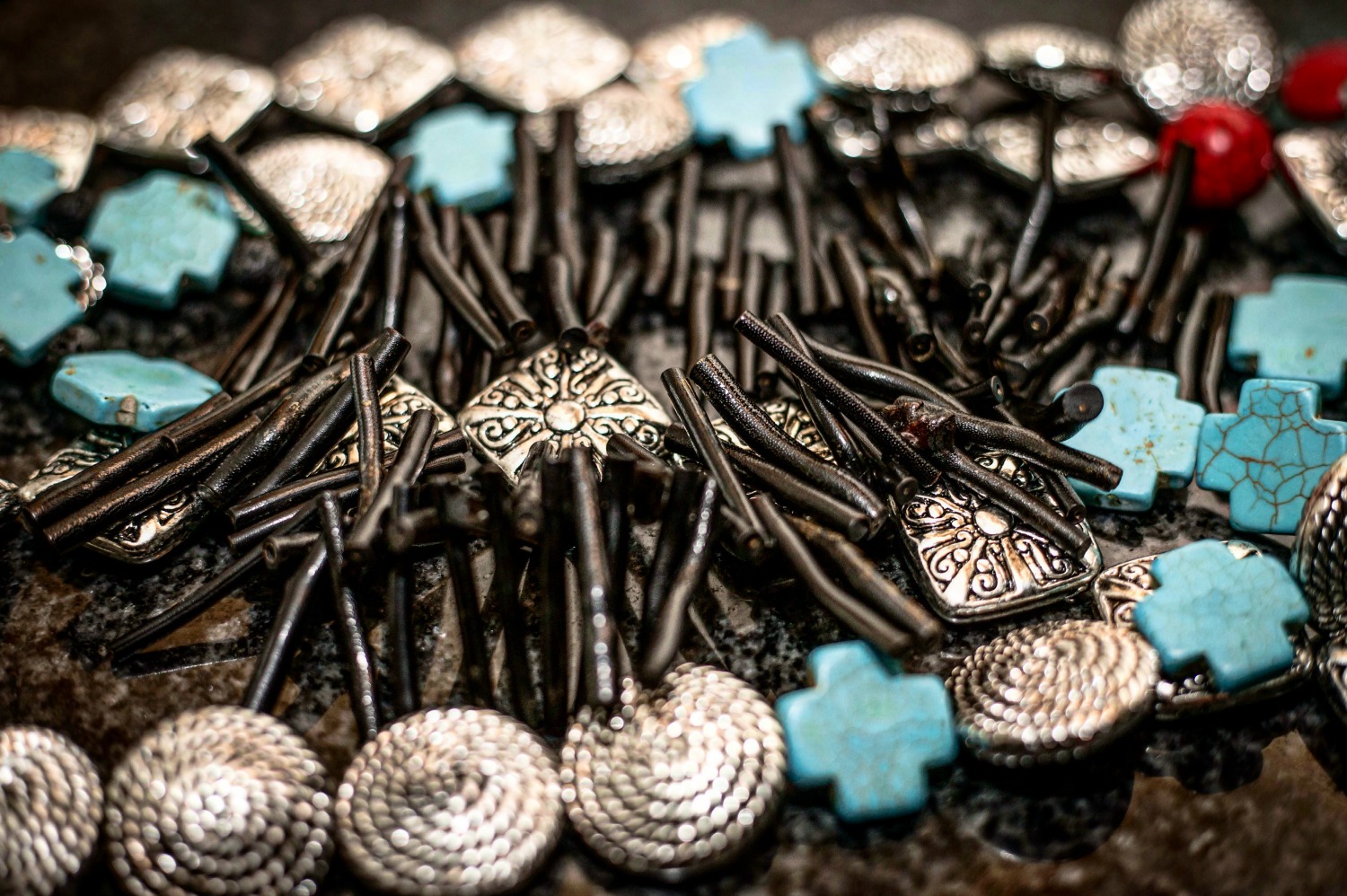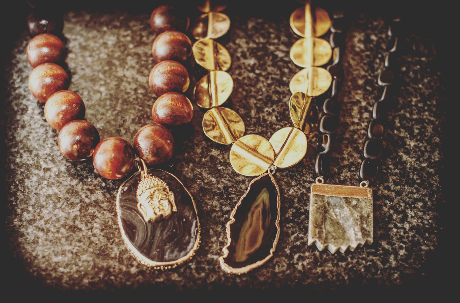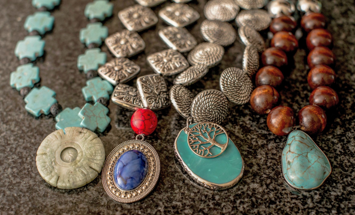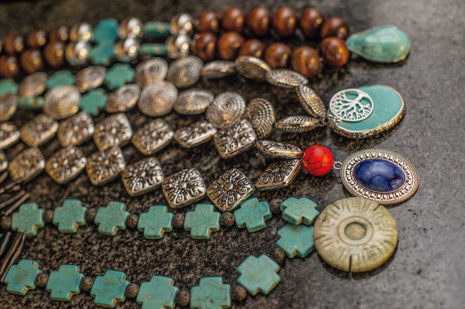 The collection of neck-wear is inspired by different cultures and regions of the world which the basis behind the EthniCITY name. As a designer from a large city, Desmond studies street style while in his own native area of Washington, DC and through his travels across the U.S. from New York to Atlanta to L.A. While traveling to urban settings which are so full of fashion and culture, Desmond gets a feel of what the urban man likes. This study of style becomes the inspiration for his designs. To decipher the “ethnic” piece of the brand’s name, the collection features materials from all over the world including Moroccan beads, metals, marble, stone, turquoise, and wood. The neck-wear is exaggerated and large in size, created with strong natural materials to identify it as a masculine creation of jewelry.