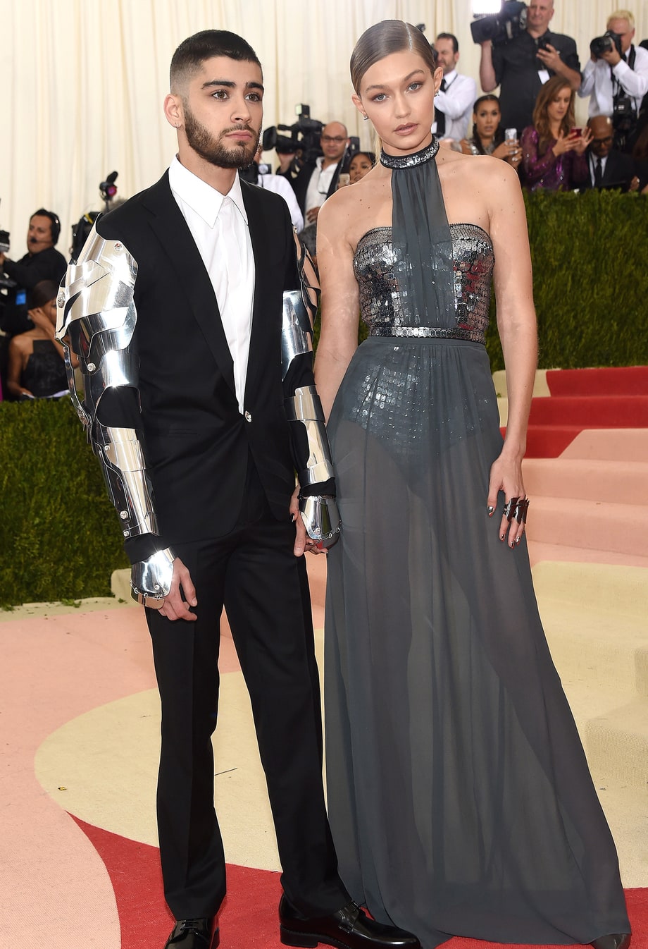 Hannah Davis looked stunning in a light blue Zuhair Murad dress of delicate fabric and monotone embroidery. I love the belt! The metal was a great contrasting accent for this look. She’s beautiful, Style Stamped at one of the most biggest nights in fashion of the year, and she’s with Derek Jeter. #Winning  Gigi Hadid wore a Tommy Hilfiger shiny scaled bodice with a monotone sheer overlay skirt. Although her boyfriend went way literal with the robot sleeves, her dress was a stunner and very simple, fashion forward, and creatively designed.