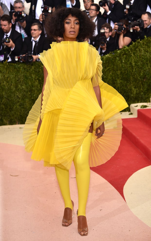 Zoë Kravitz, the young beautiful fashionista, donned an art deco haute couture Valentino dress with artsy heels and a lace mask.  From the back the dress appeared as a large bow, a total contrast from the front but certainly the more interesting part of the dress. Solange, who is well-known for her eclectic style, was in her per-usual head turning attire in a lemonade yellow David Laport dress with matching liquid leggings. I wonder if she picked out the color of her outfit before or after April 23rd?