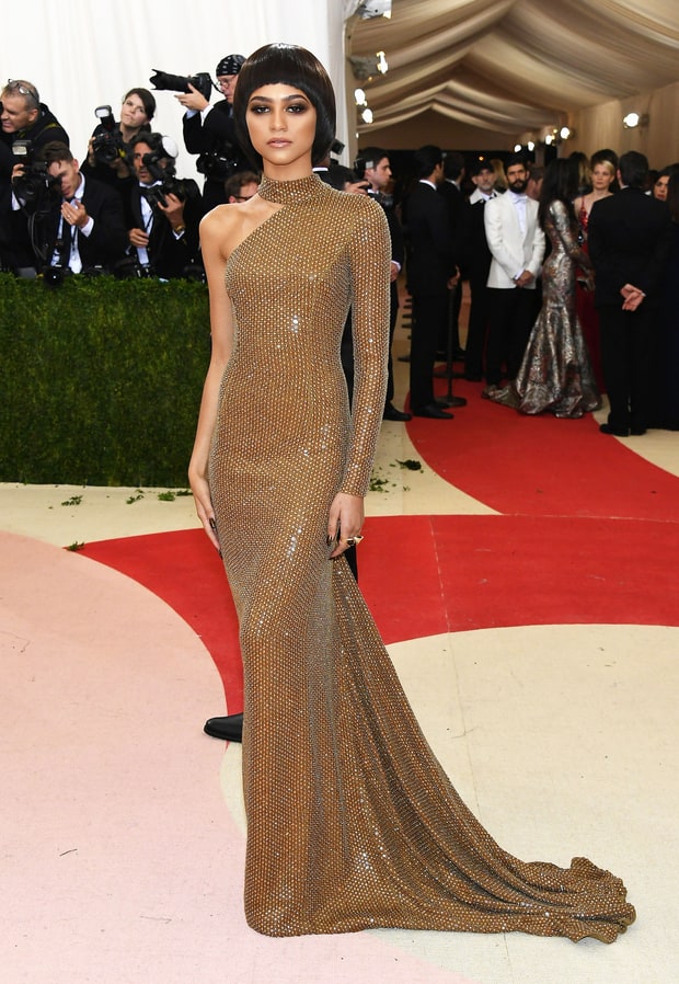 There was a lot of metallic dresses on the carpet which puts us more in the mindset of science, technology, robots and other fantasy machines. I’m sure all these shiny dresses were crafted with “the age of technology” subtitle at hand, which isn’t necessarily a mis-interpretation of the theme, just a more literal one. I was disappointed in Taylor Swift’s short Louis Vuitton cut out side number and gladiator heels as it looked better suited for a less mature event like the Disney awards or some other bubble gum pop award show. Jourdan Dunn certainly nailed the robot look in her Balmain dress. Kim’s breastplate was similar to Jourdan’s as she donned Balmain as well, but her dress is much shinier and not as restrictive. Her wet looking hair and ear clip put her in full costume and the person she was with, who spoke only one word on the carpet when asked about his look and strange eyes and broken dress code…was in full half man half amazing mode I guess. Or “vibe” as he described it. Kanye is so extra! This theme was right up his alley. Zendaya looked like a retro Barbie or Dianna Ross in costume, but I was looking forward to something a little more original and eye-catching from her.