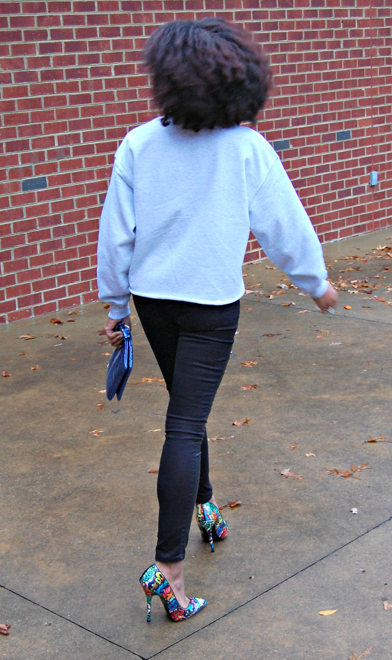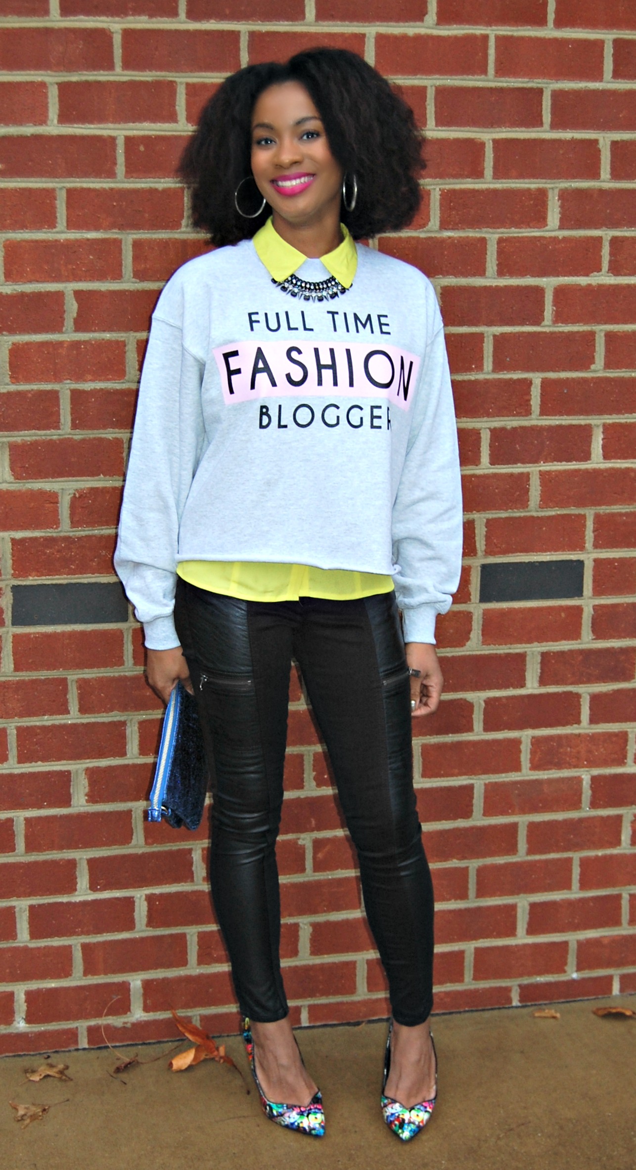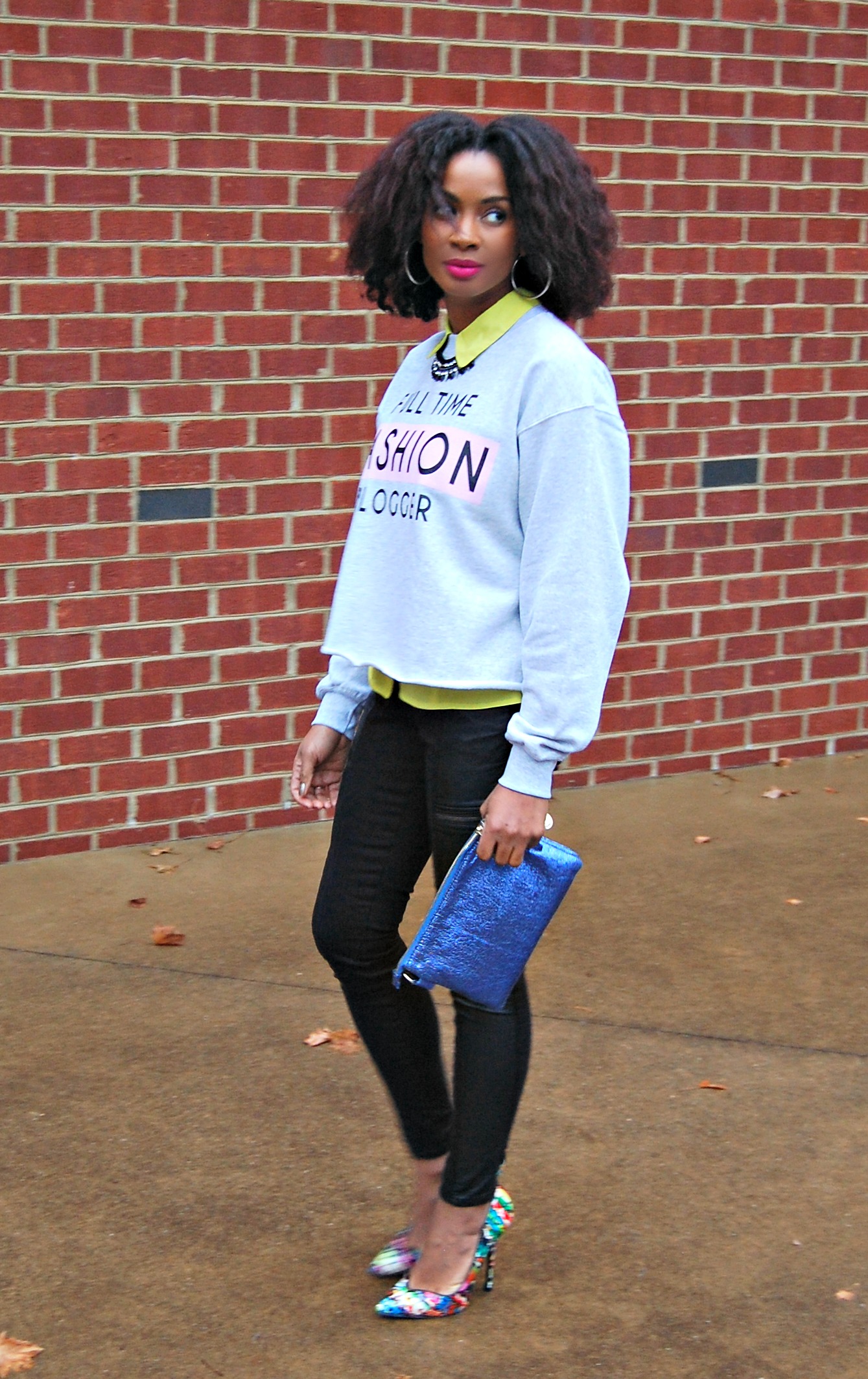 Wearing my favorite new sweatshirt from River Island, Jeans with faux leather and zippers (similar here), and my Keyshia Cole for Steve Madden graffiti pumps (similar here).