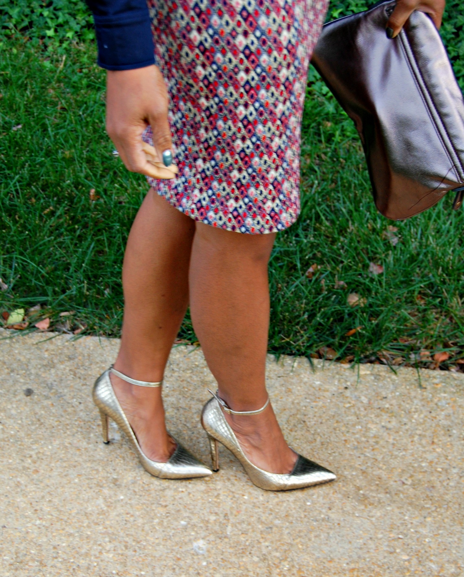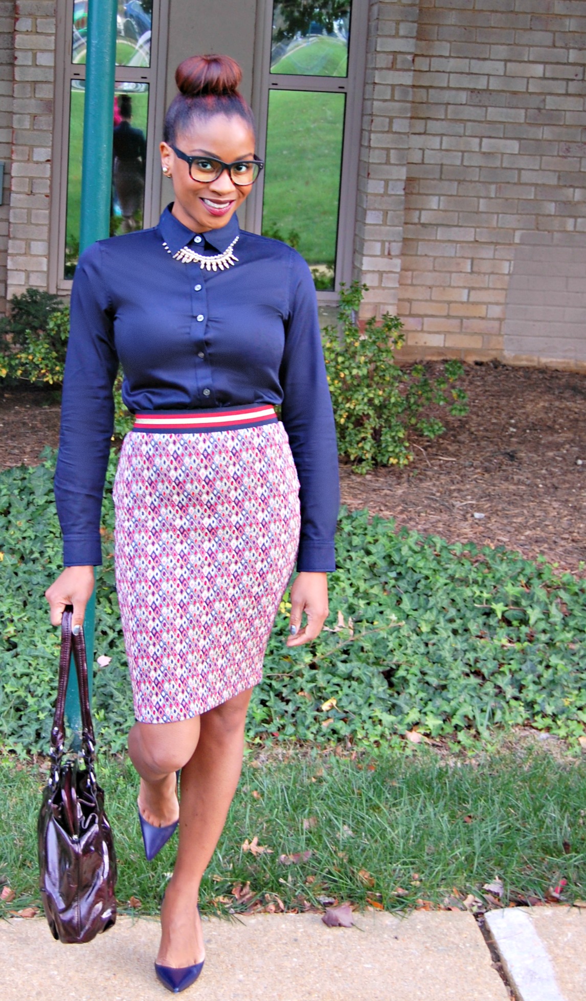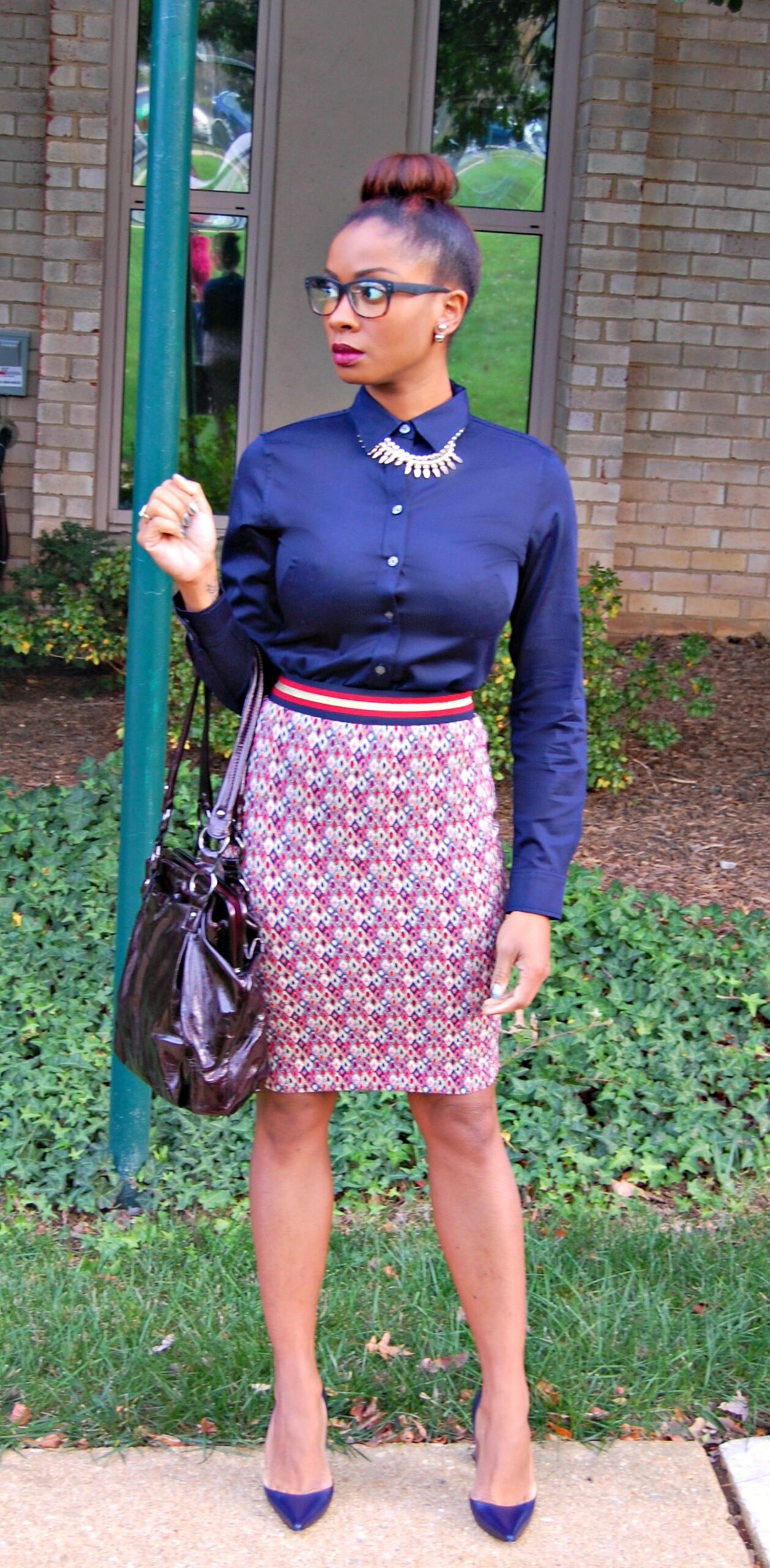 This Jacquard pattern skirt is a perfect pattern to go from work to out. I paired the skirt with a navy button down and blue heels for work, and did the switcheroo to gold heels for after work. I also switched up the bag for this work to after-hours chic look.