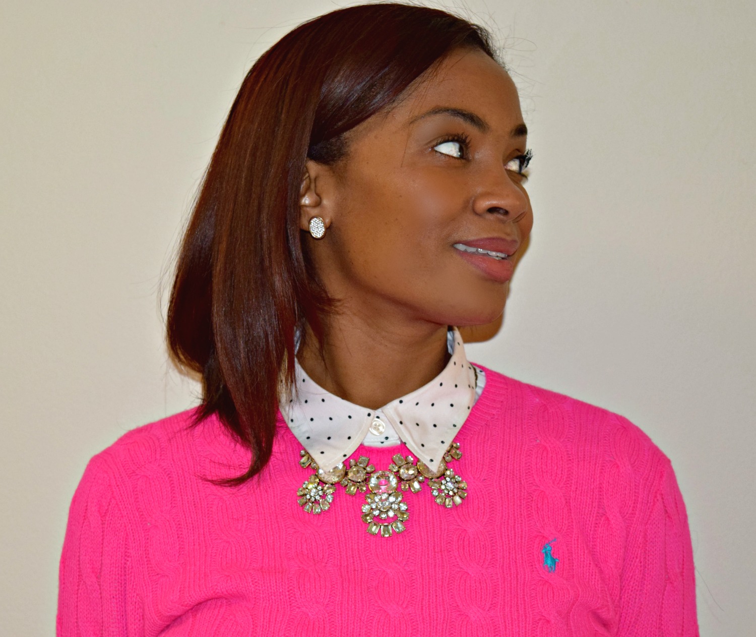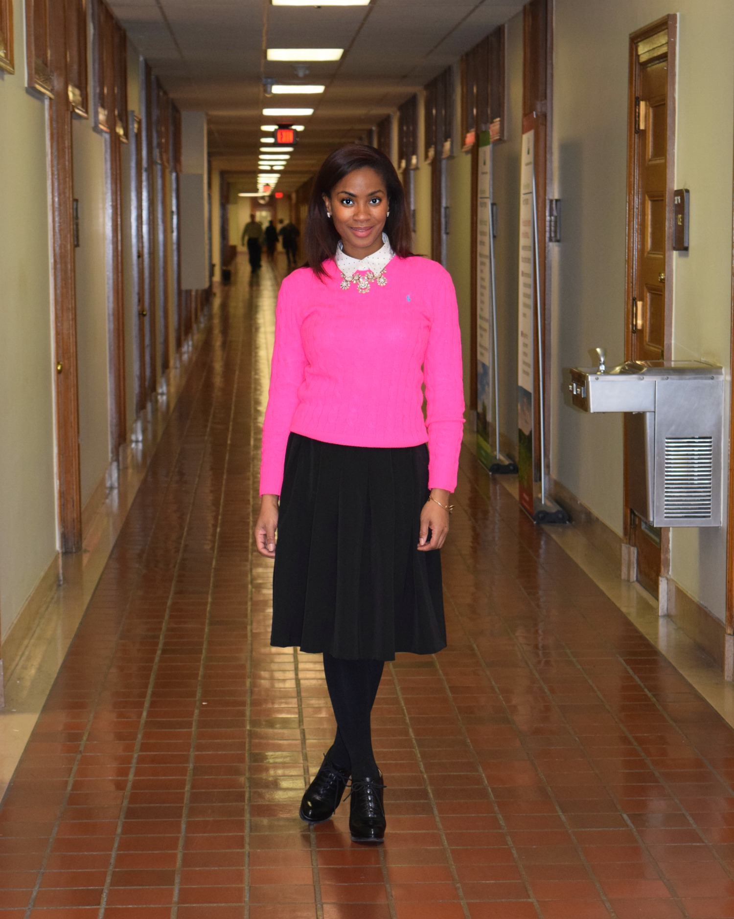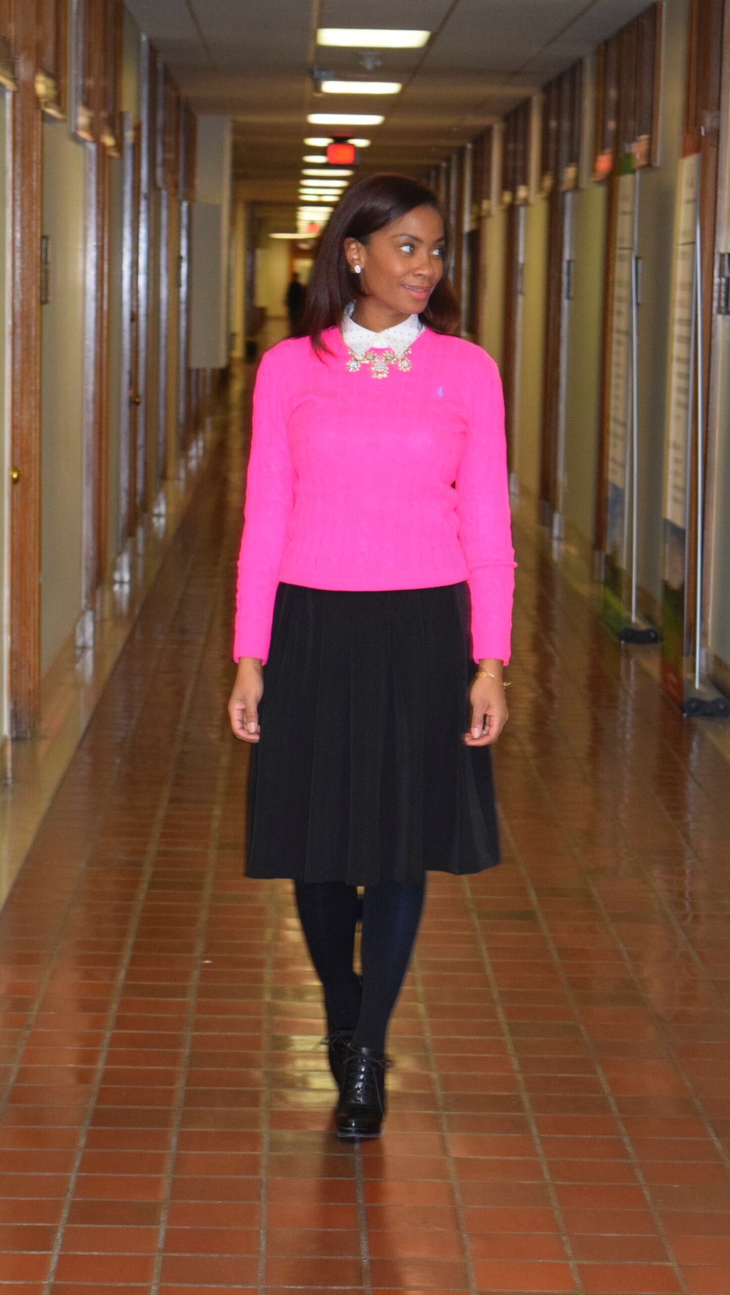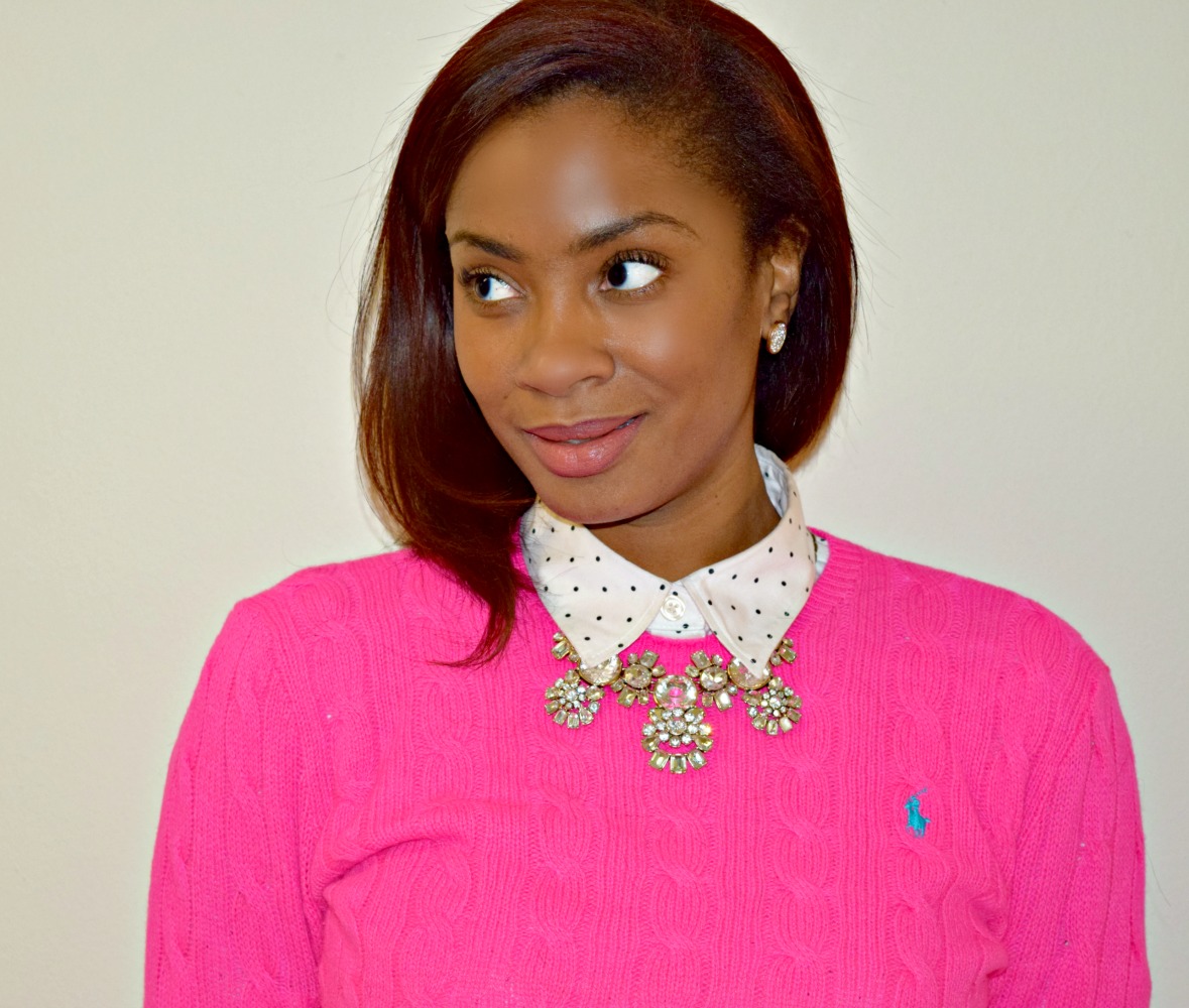 In this work wear outfit I wore a button down polka-dot shirt from Banana Republic under a hot pink Ralph Lauren cable knit sweater. Under my knee-length skirt I had on two pairs of tights, one regular and one fleece lined. I wore lace up booties and a J. Crew necklace for accessories. I had on a full-length coat, but needless to say I was warm both inside and outside of work!
